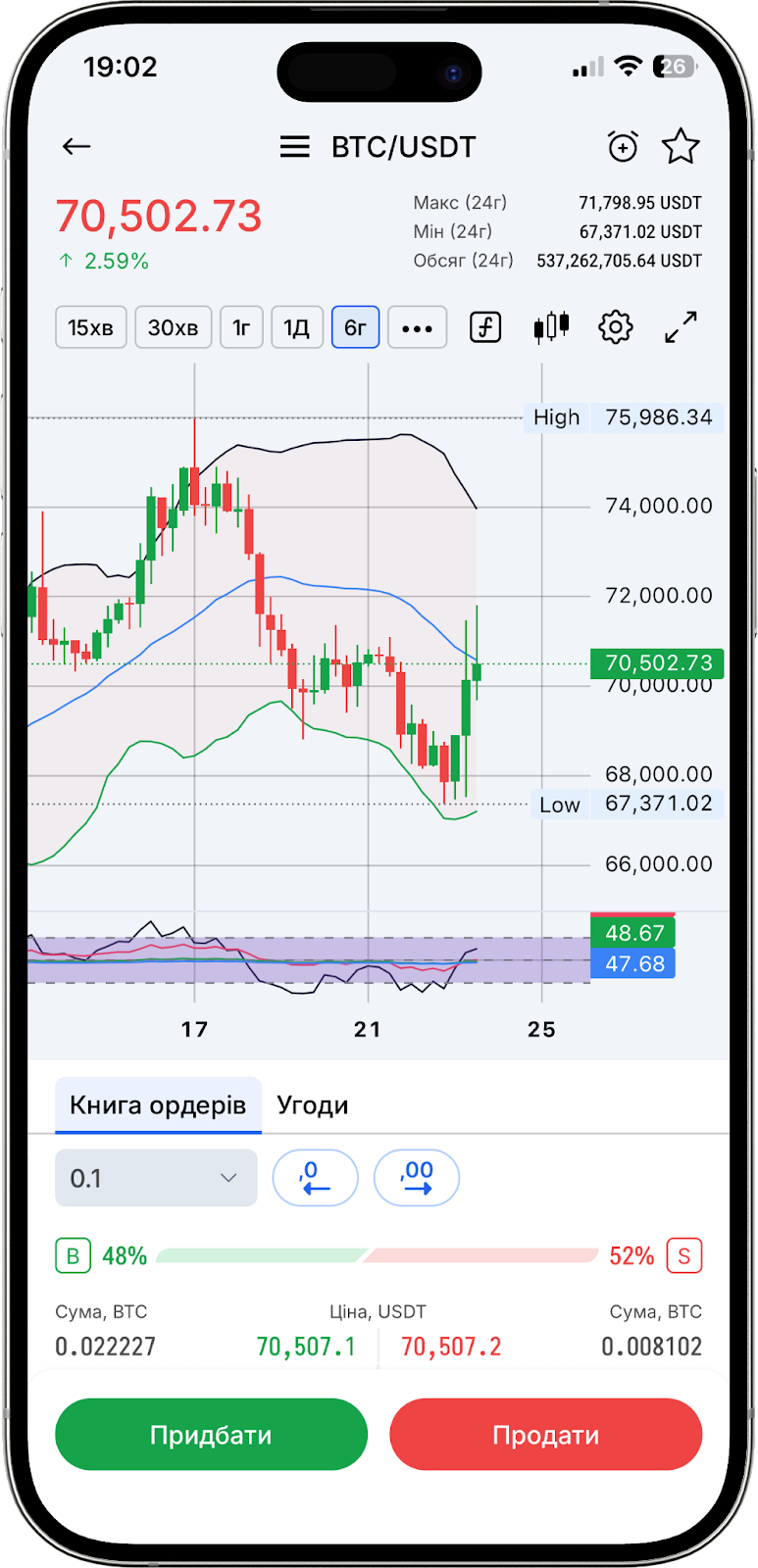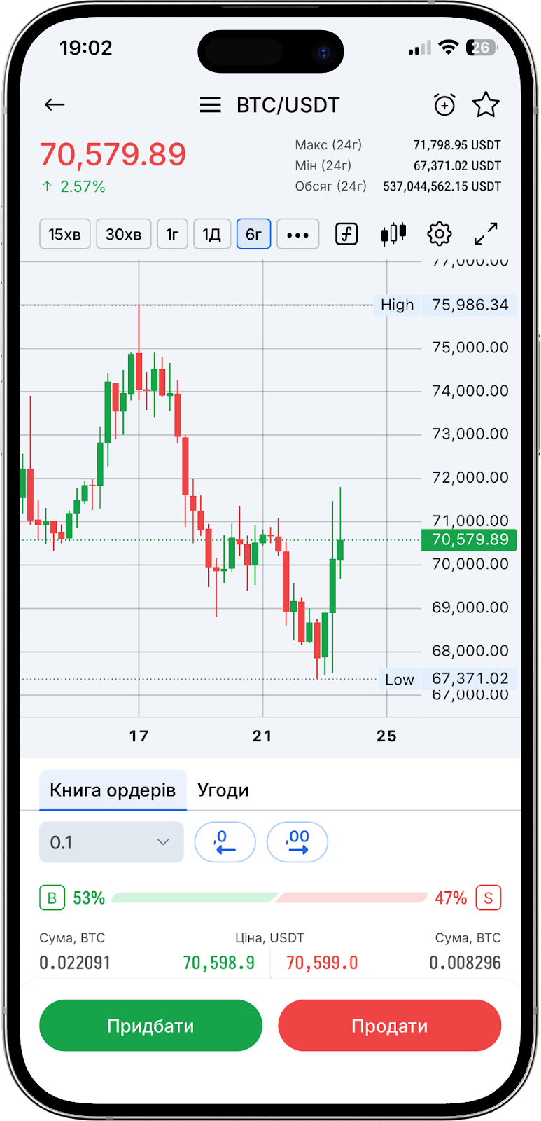 Повертаючись до розділу "Маркети": у нижній частині торгового терміналу знаходиться біржовий стакан (ордербук). Це інструмент, що відображає список актуальних заявок на купівлю і продаж активу в режимі реального часу. Він допомагає трейдерам оцінювати ліквідність ринку, виявляти можливі рівні підтримки і опору, а також приймати рішення про вхід і вихід з угод.
