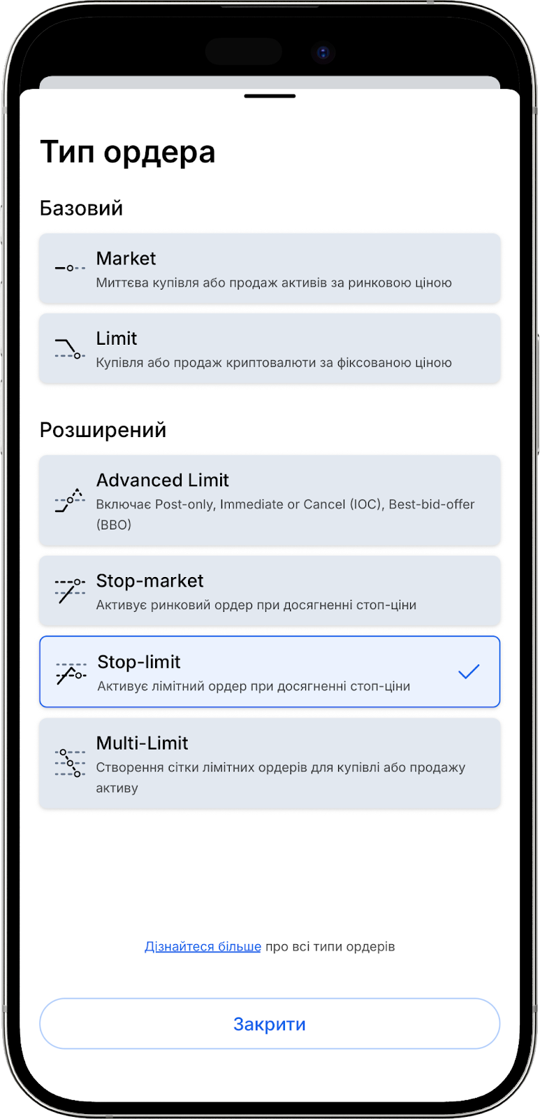 Типи ордерів поділяються на “Базові” та “Розширені”.