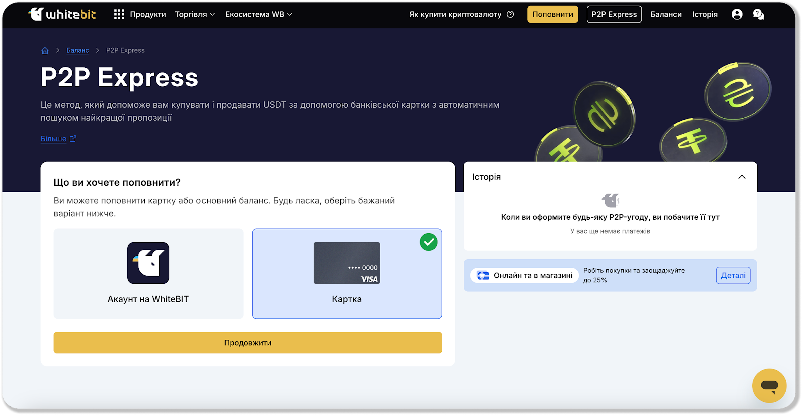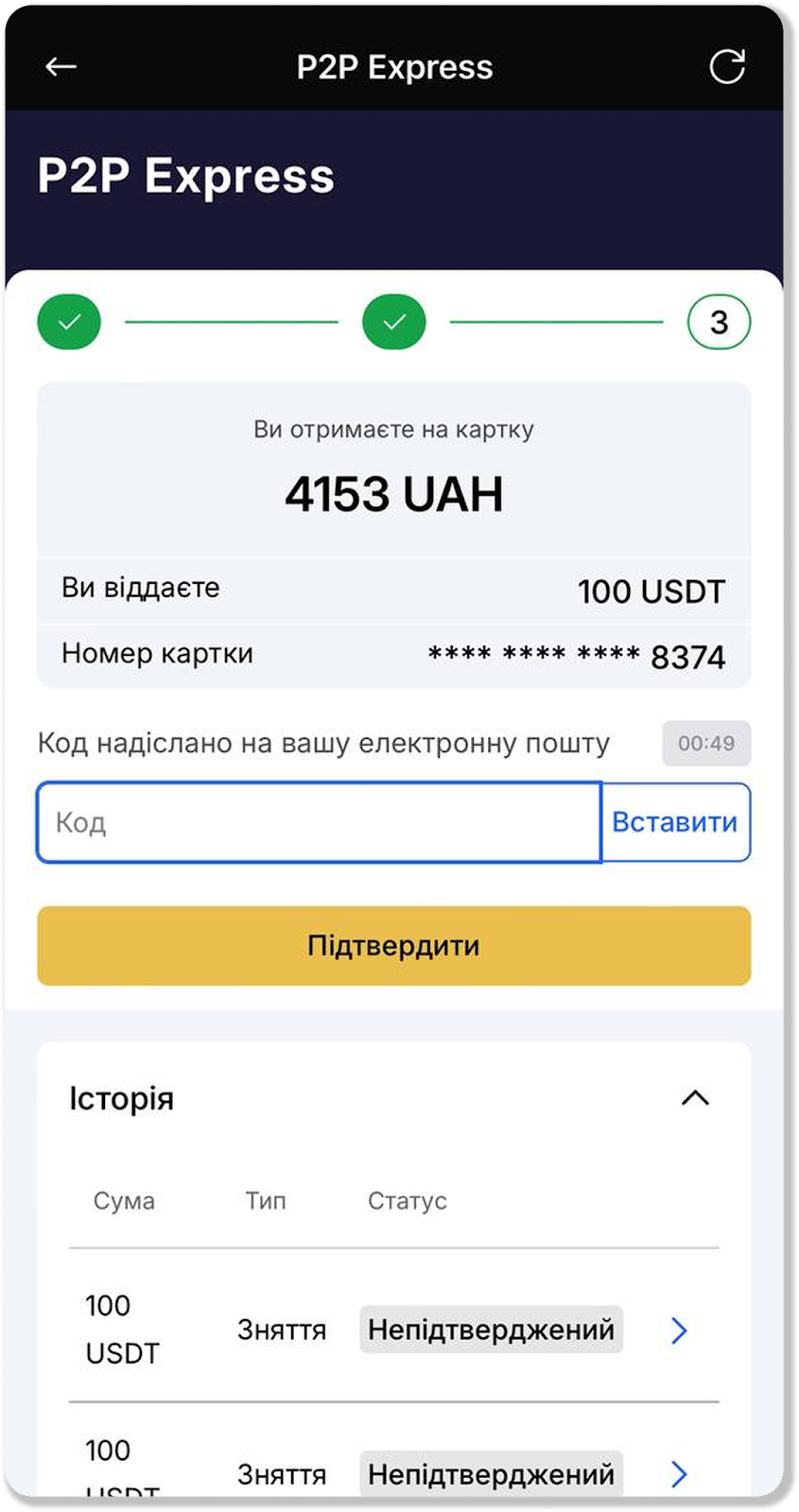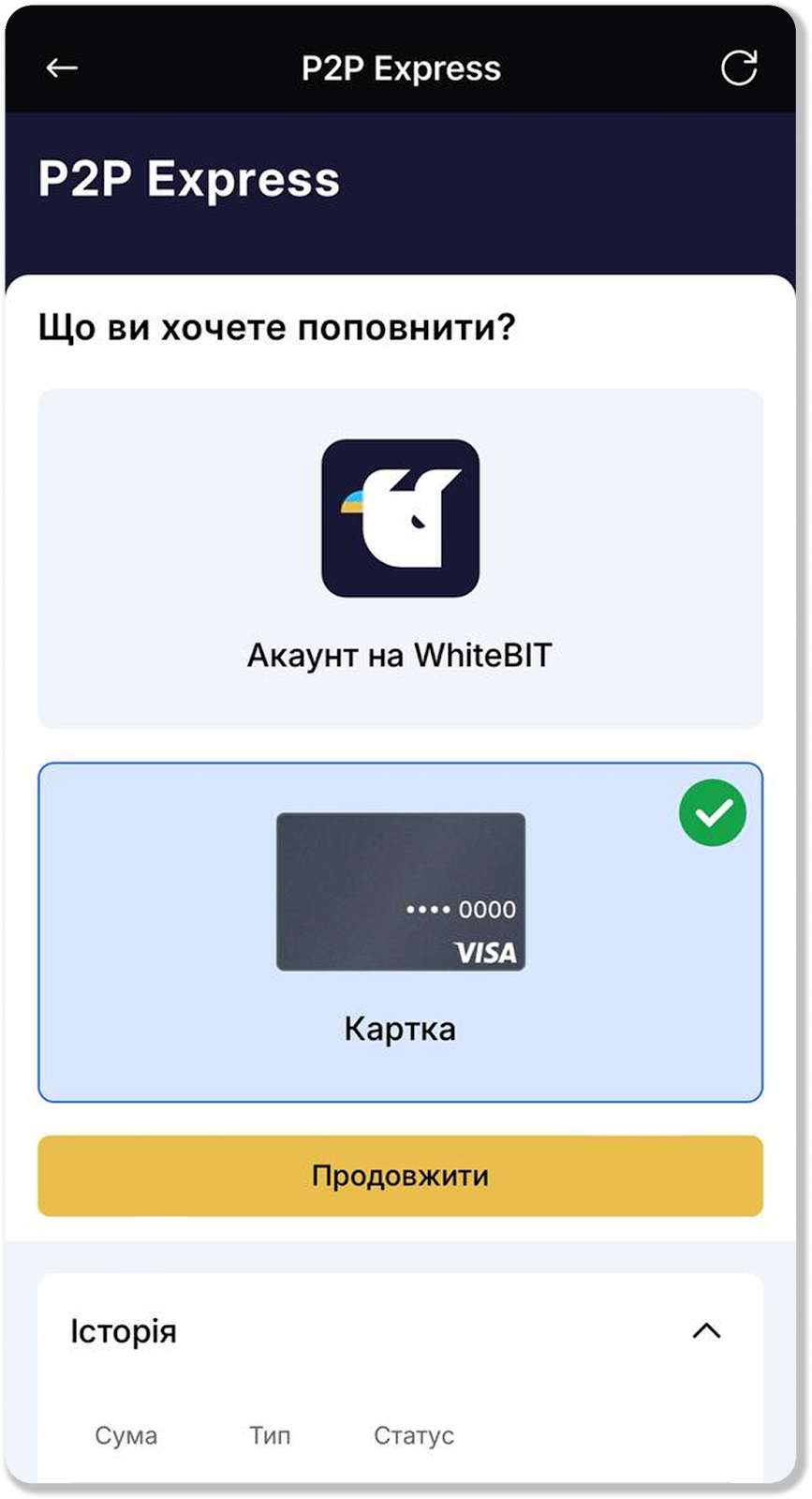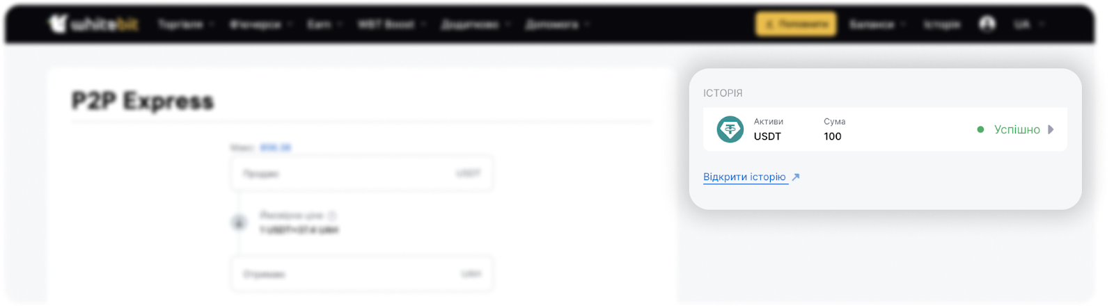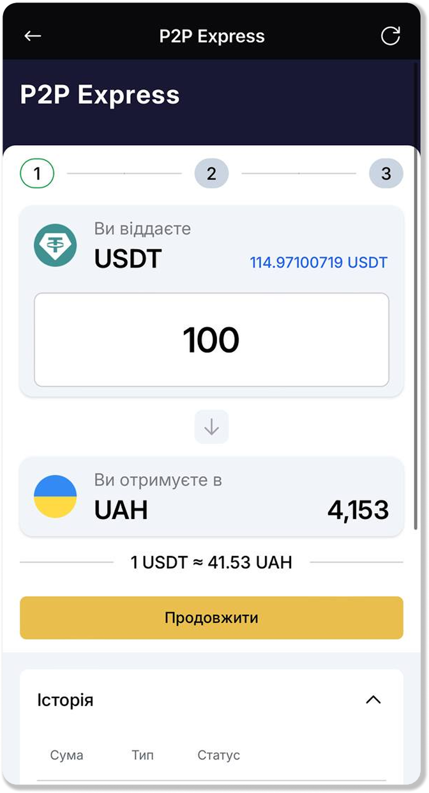 Обмін здійснюється за допомогою P2P-сервісу сторонньої платформи. При обміні USDT на UAH через Швидке поповнення USDT будуть конвертовані в UAH і надійдуть на зазначену вами карту.