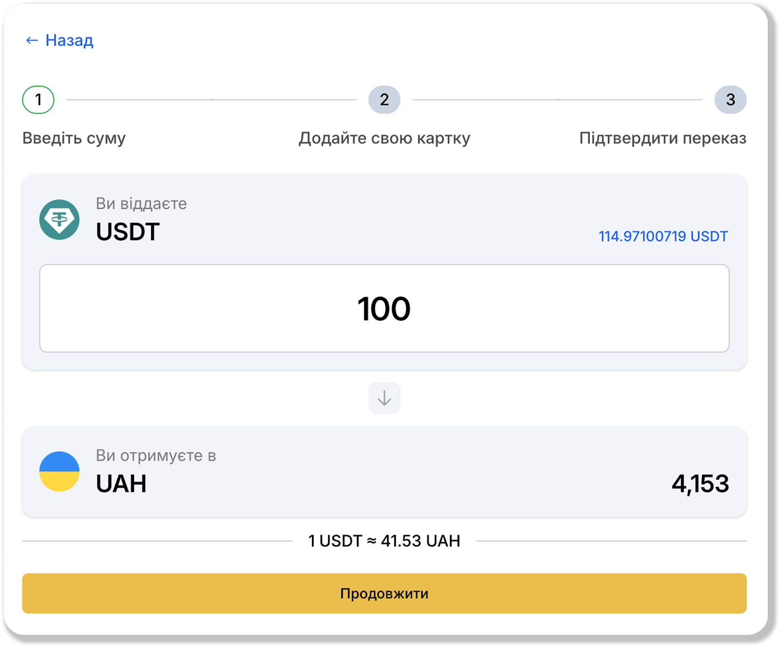 У наступному вікні вкажіть бажану суму обміну та натисніть "Продовжити". Тут ви також зможете побачити, скільки UAH буде переведено на вашу картку після успішного проведення обміну.