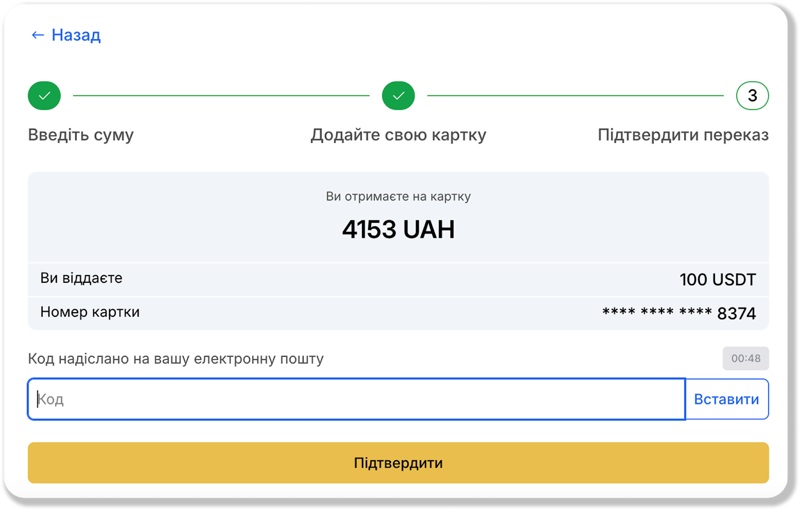 4. Підтвердження обміну. Далі потрібно підтвердити операцію, вказавши код, який було надіслано на вашу пошту, і натиснути кнопку "Продовжити".