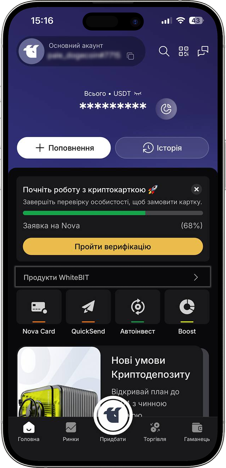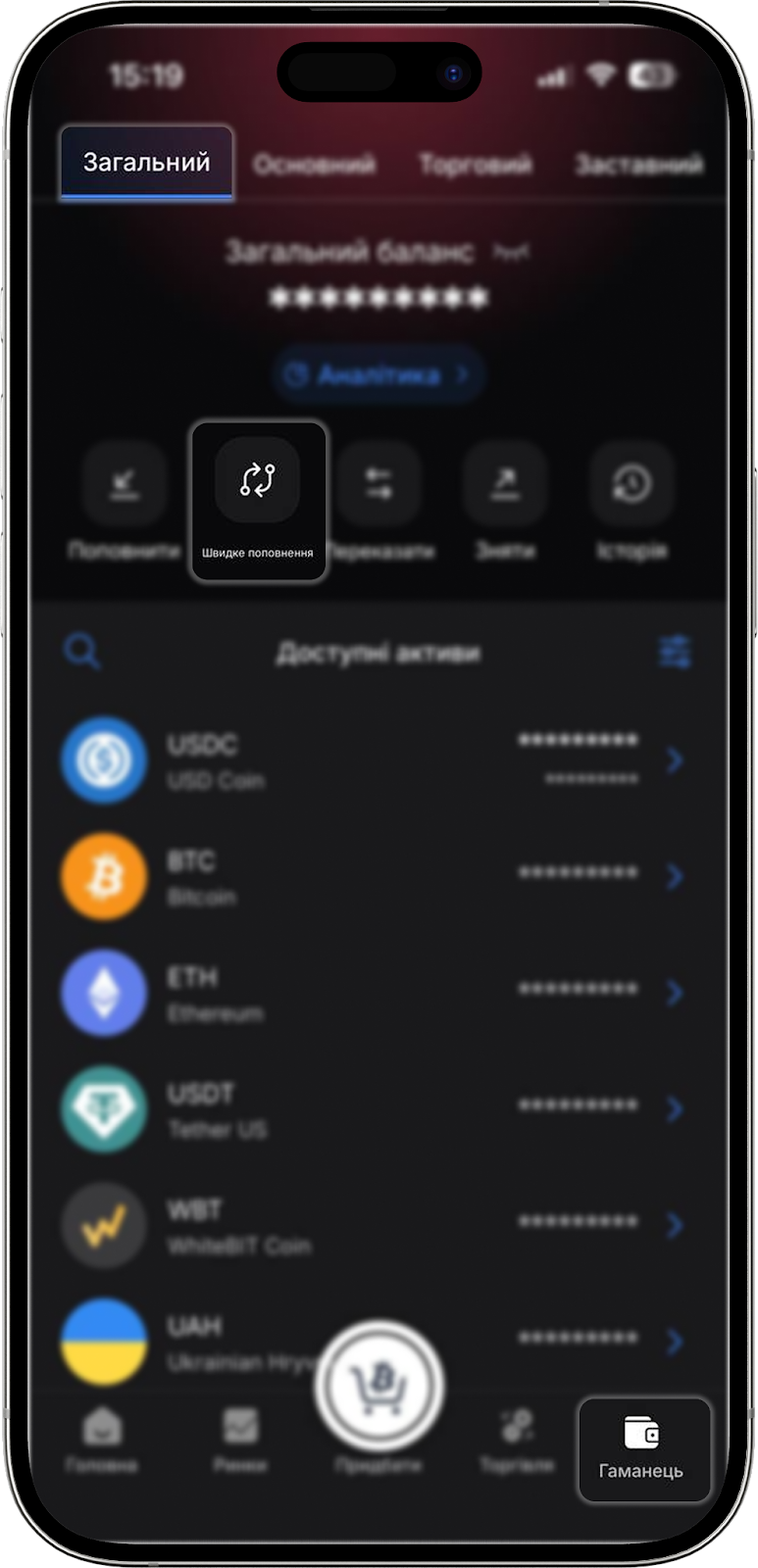 Також "Швидке поповнення" можна знайти в меню "Гаманець" або обравши USDT або UAH в меню "Гаманець".