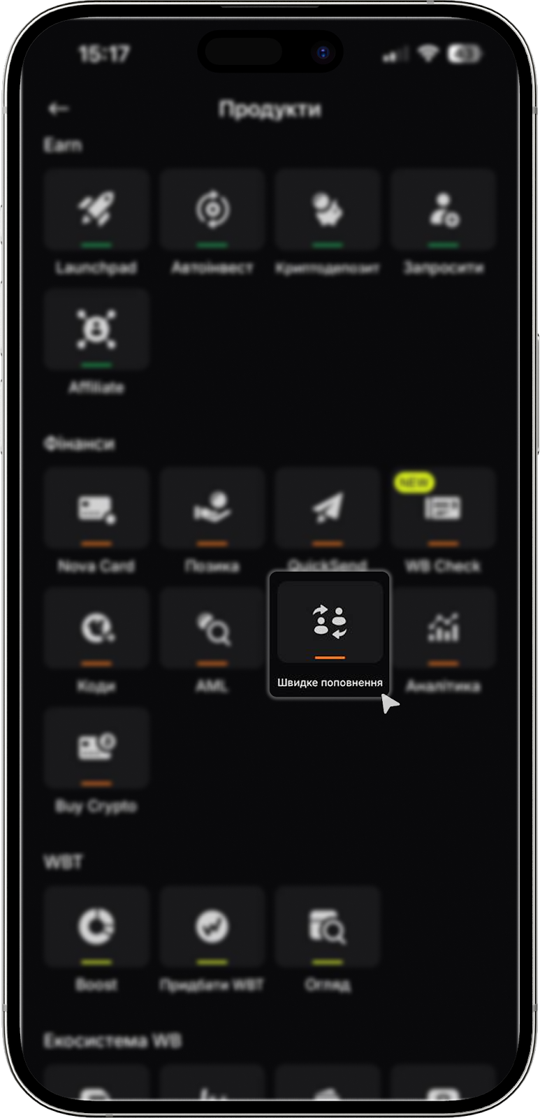 1. Навігація до вкладки балансу. Щоб скористатися функціоналом, на сторінці "Головна" виберіть функцію "Швидке поповнення".