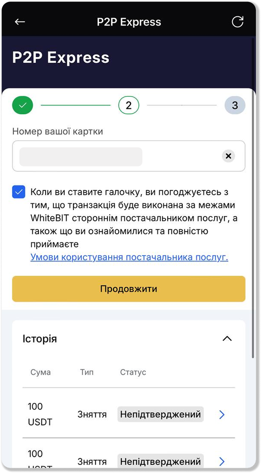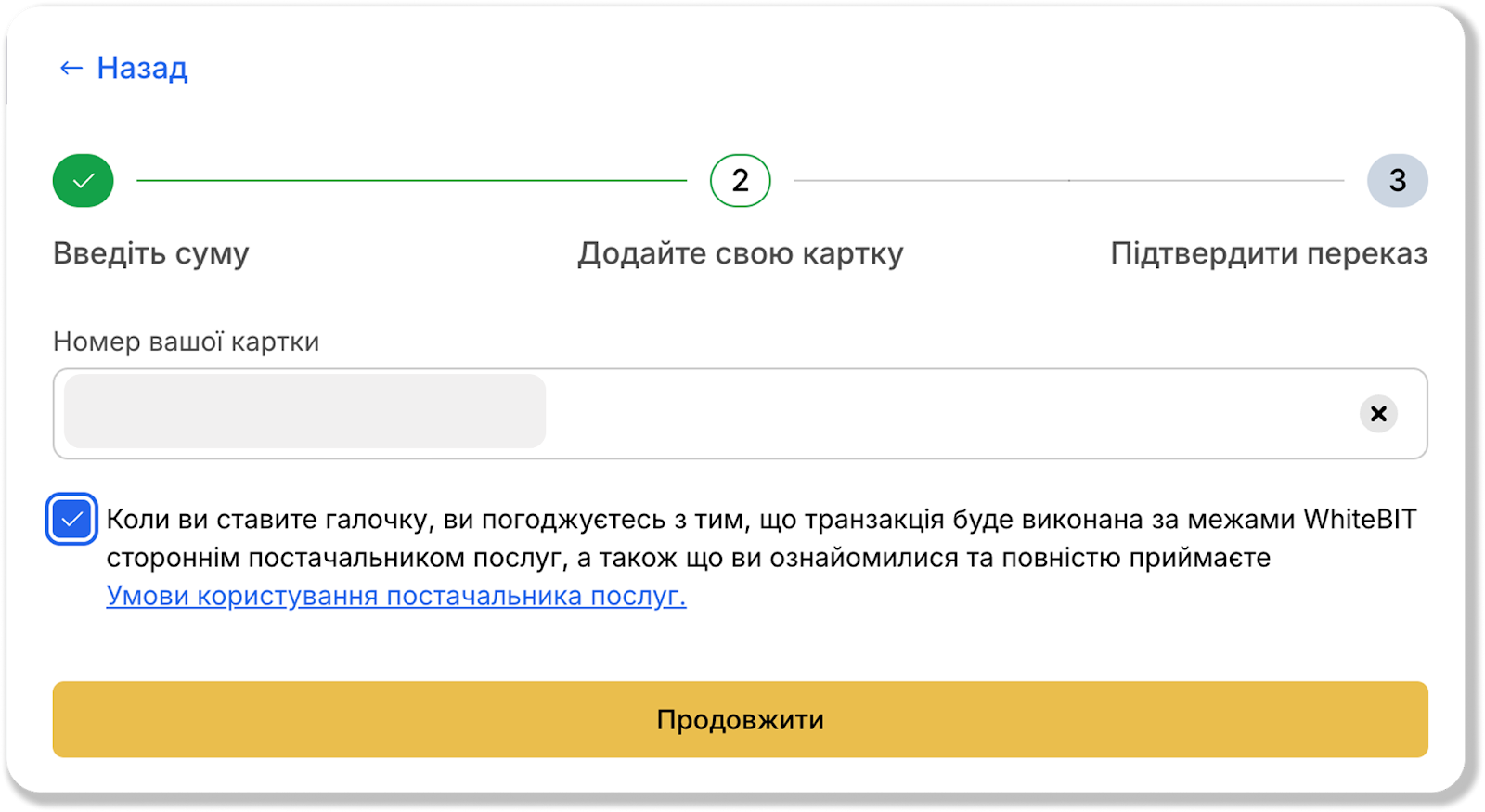 Зверніть увагу, що необхідно ознайомитися з умовами користування постачальника послуг і поставити прапорець, що ви згодні з тим, що транзакцію буде виконано поза біржею WhiteBIT стороннім постачальником послуг, а також підтвердити, що ви ознайомилися і повністю приймаєте Умови користування постачальника послуг.