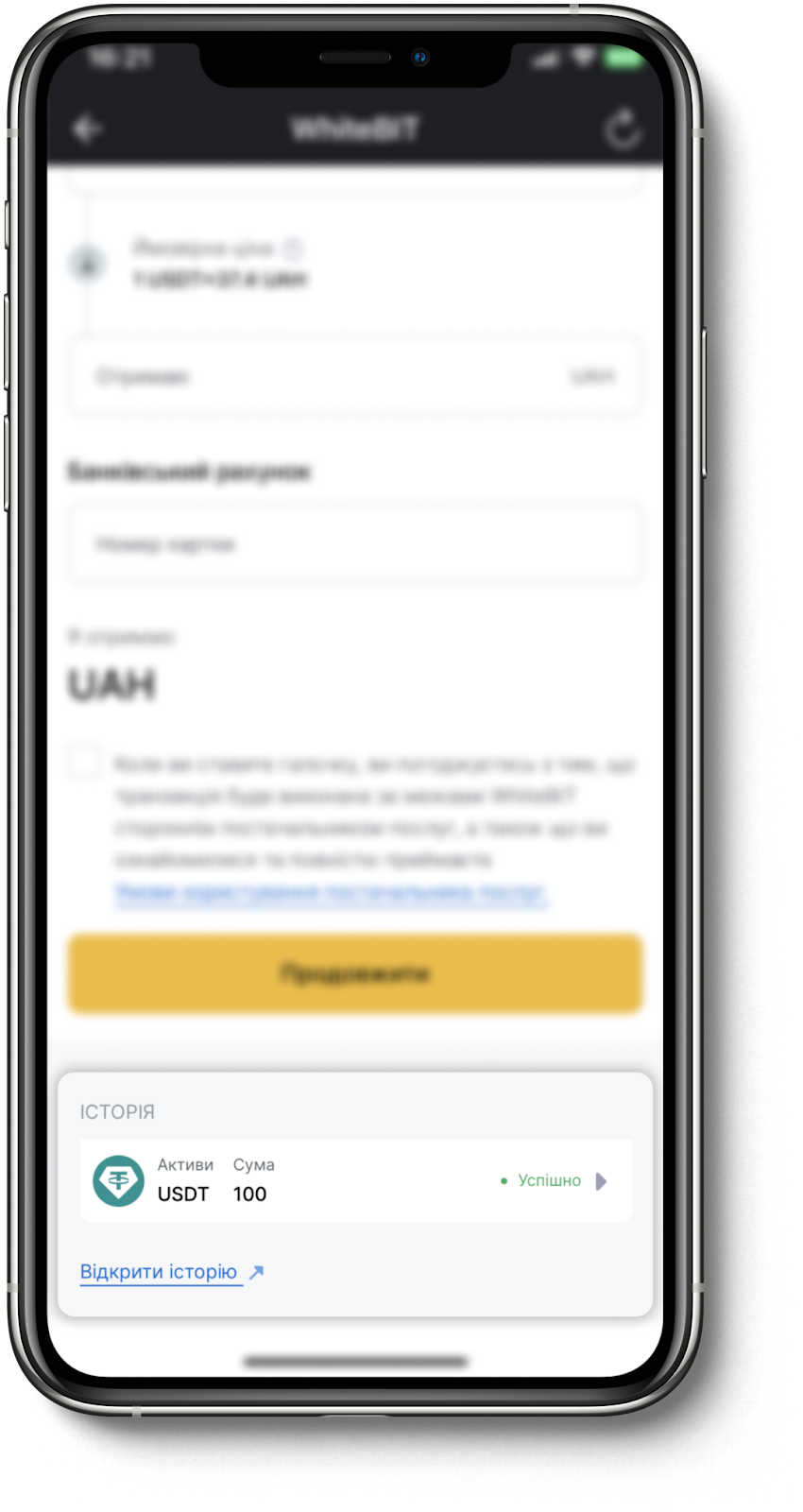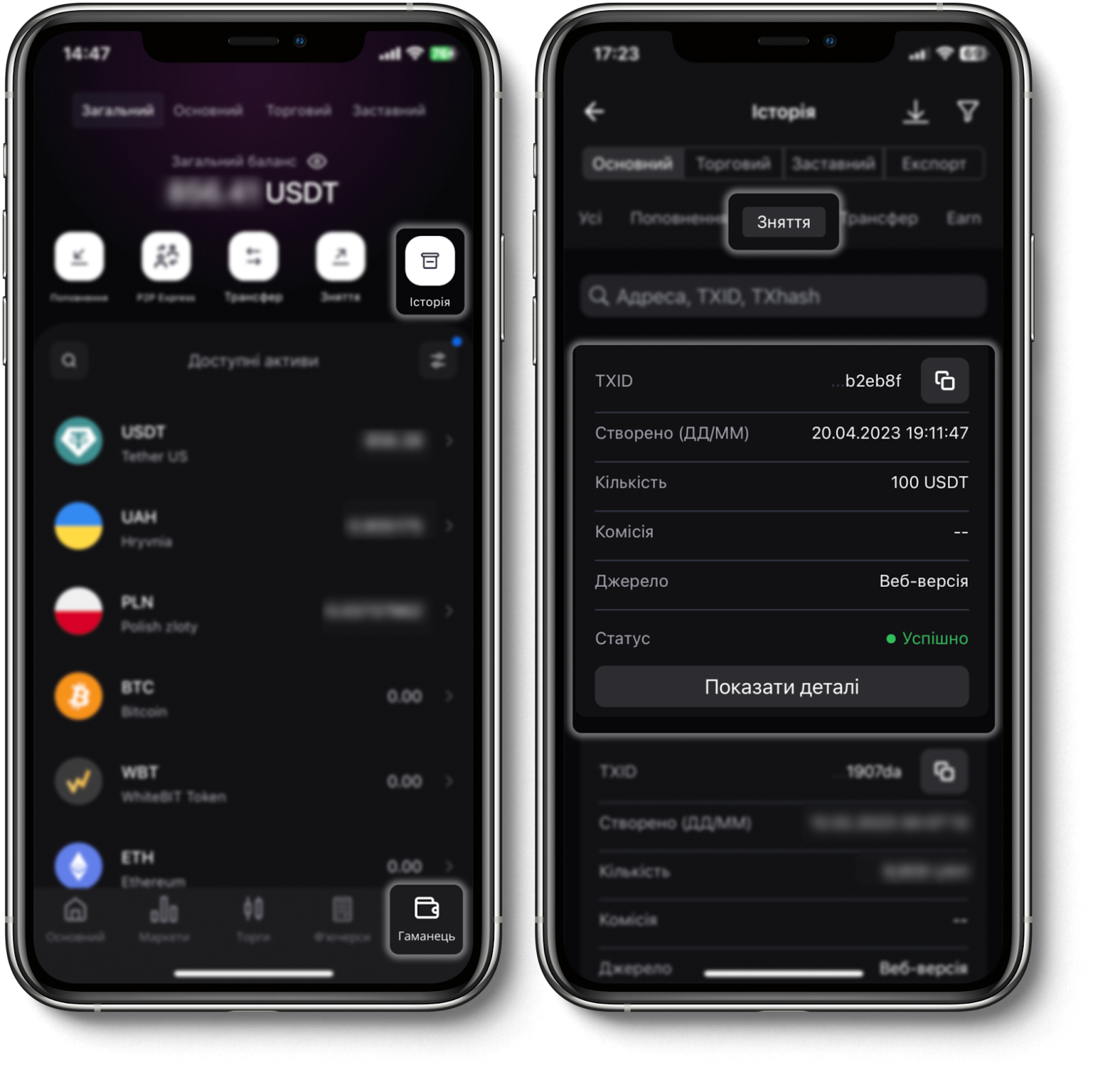 Також ви можете перевірити деталі обміну, перейшовши в розділ "Гаманець" і вибравши розділ "Історія" в застосунку WhiteBIT. У вкладці "Зняття" вам будуть доступні деталі вашої транзакції.