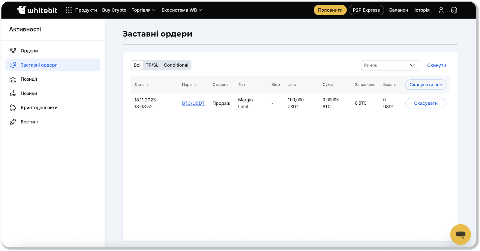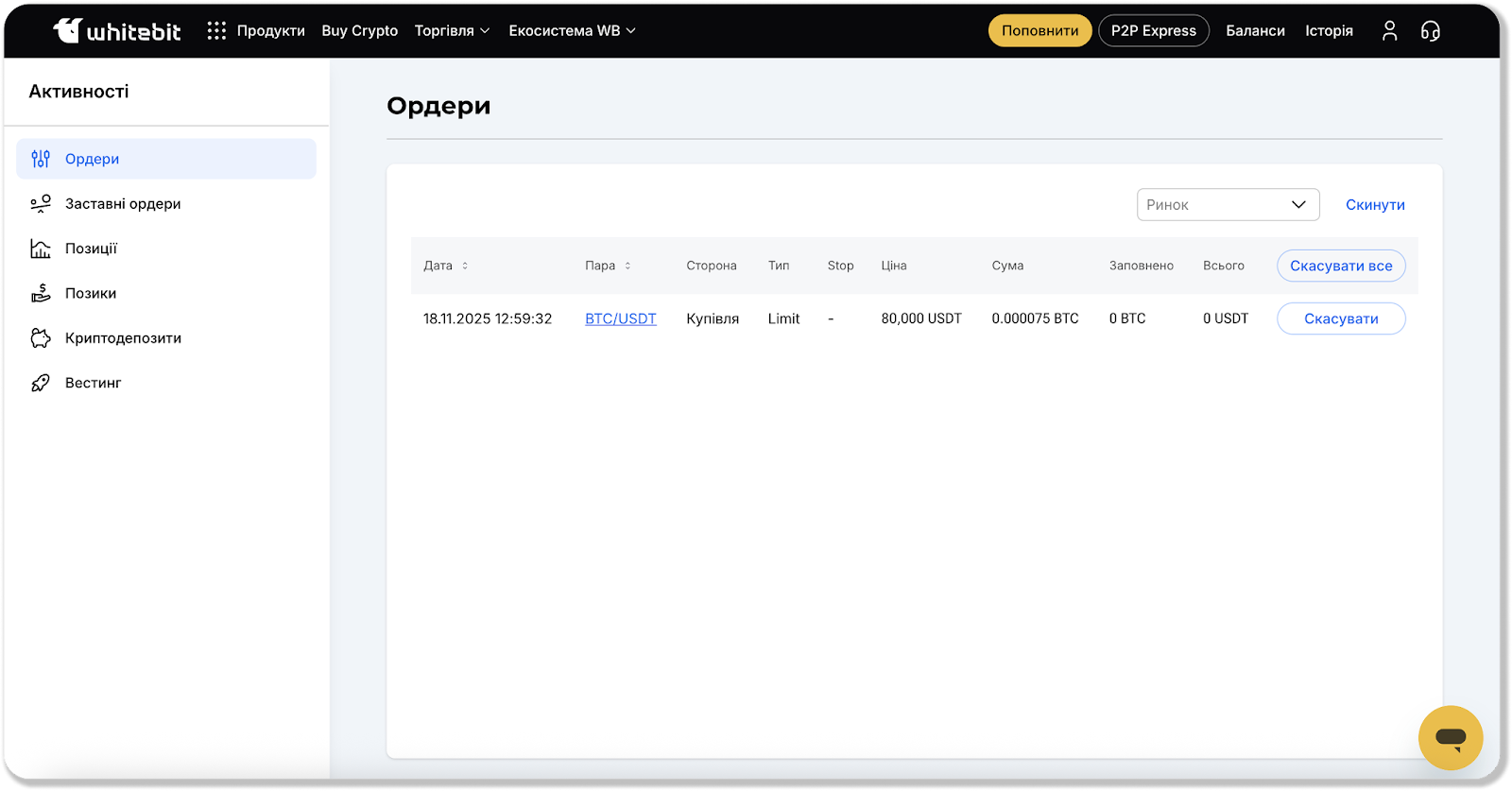 У правій верхній частині сторінки можна обрати конкретний ринок – тоді відображатимуться лише ордери на цьому ринку. Щоб скинути фільтр, натисніть кнопку “Скинути” – після цього буде показано всі ваші активні ордери без фільтрації.