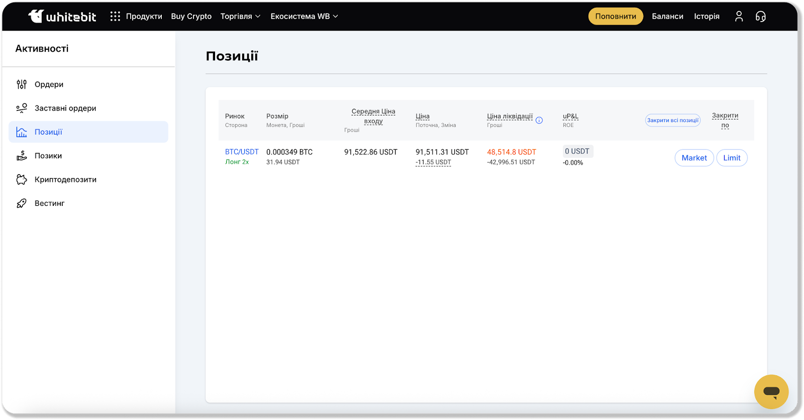 Зверніть увагу: Якщо у вашому регіоні, у зв'язку з вимогами місцевого регулятора, деякі можливості на платформі стали недоступними (наприклад, торгівля ф’ючерсами) але у вас залишились відкриті позиції, саме цей розділ дозволяє відстежувати та керувати всією вашою активністю, навіть якщо сам доступ до функції наразі обмежено.