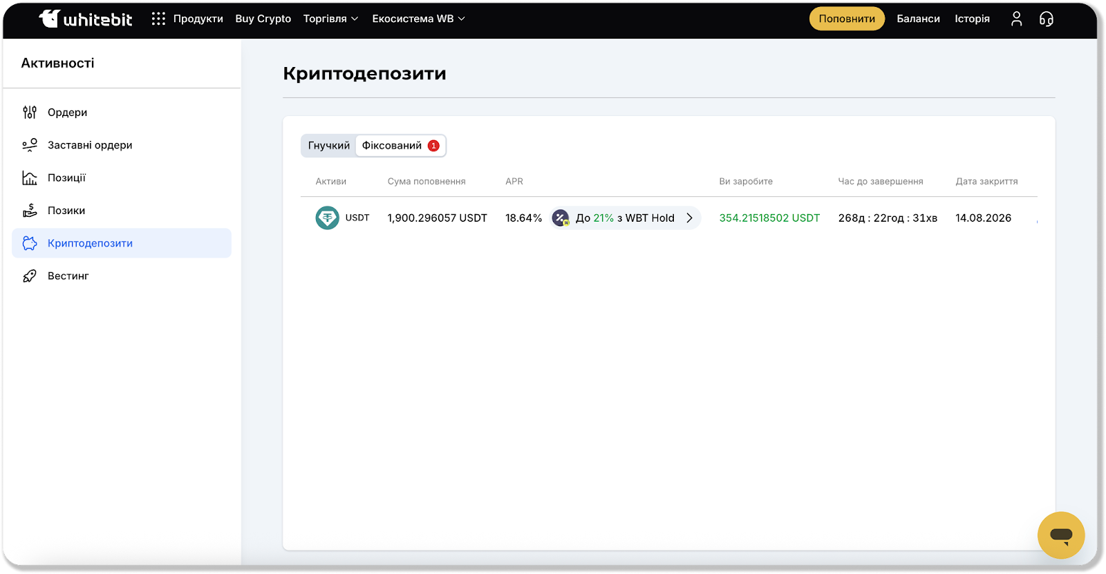 - Активи – криптовалюта, яку ви внесли у гнучкий депозит;
