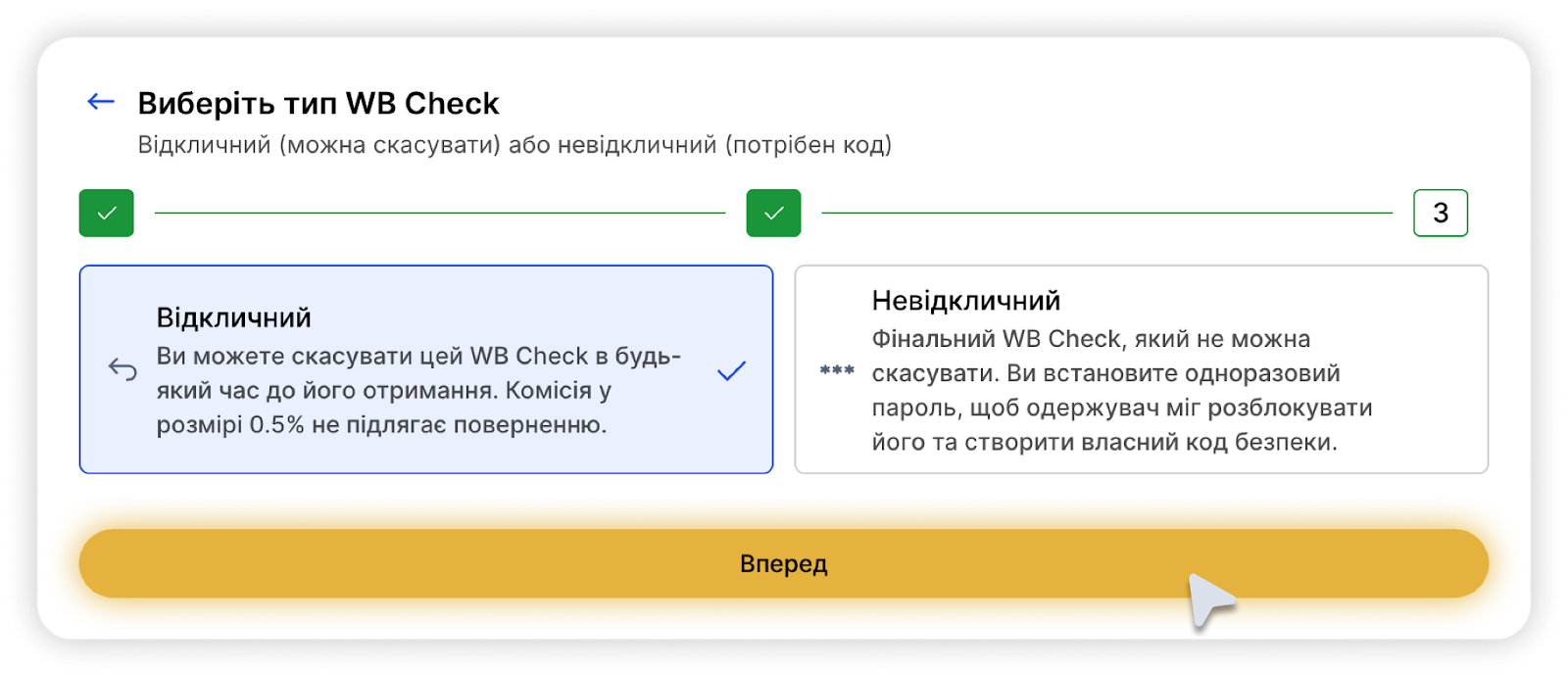 5 - Виберіть тип чека відповідно до потреб у безпеці (Відкличний або Невідкличний чек);