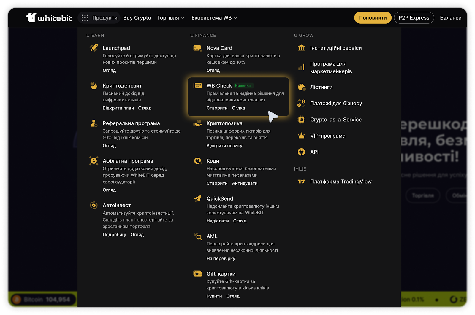 2 - У розділі "Продукти" перейдіть на сторінку "WB Check", яка знаходиться в секції U Finance.