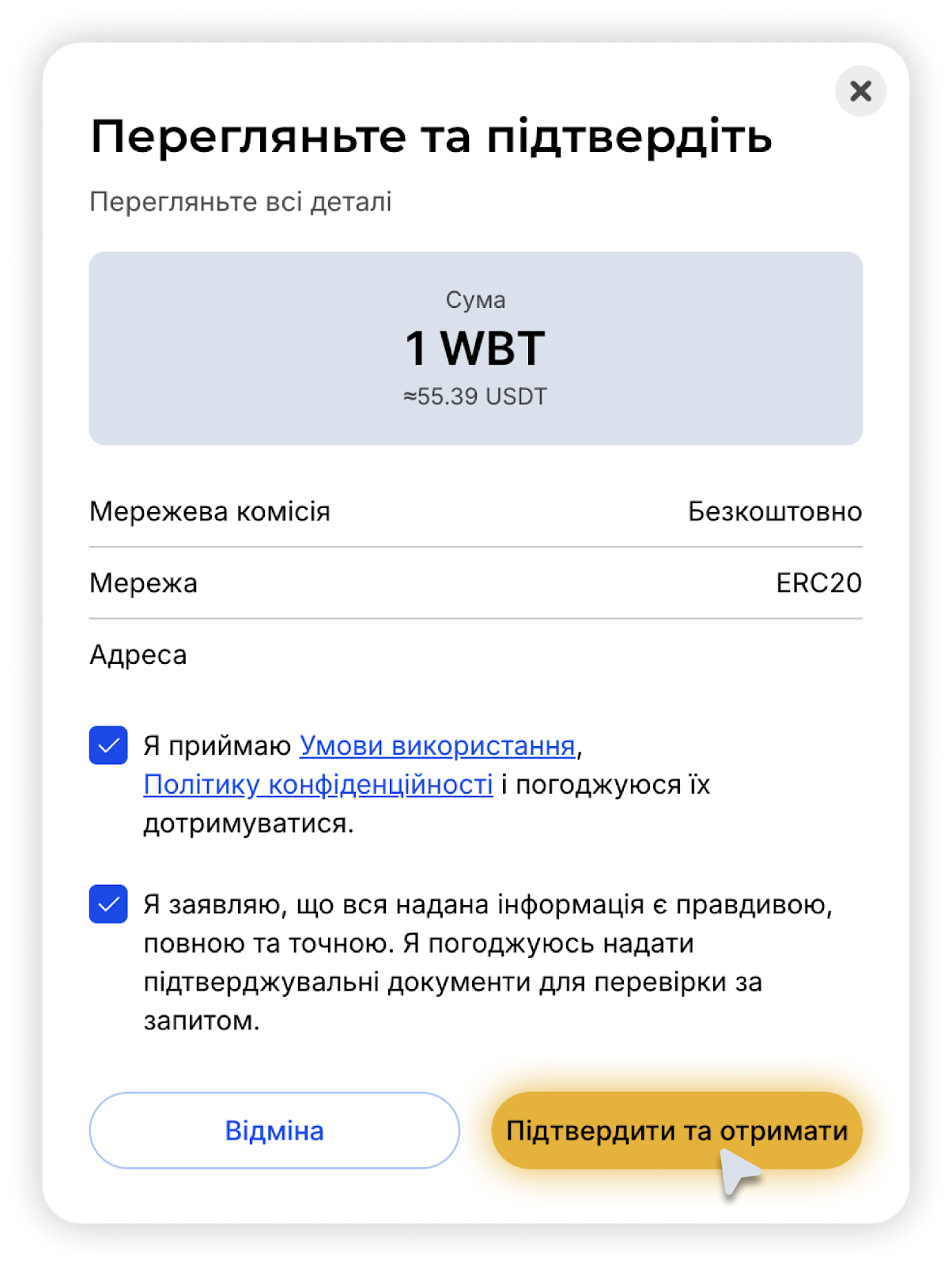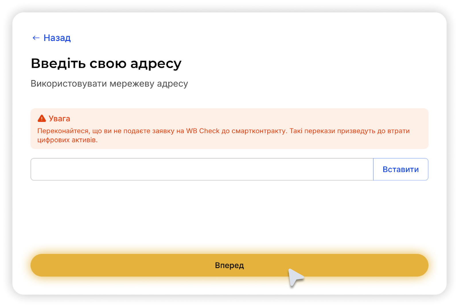 4 - Введіть адресу гаманця для отримання цифрових активів.