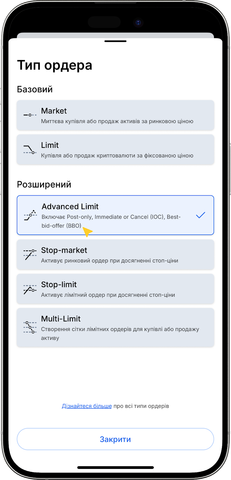 Для детальнішої інформації про кожен тип ордера та їхні відмінності, перегляньте нашу статтю про типи біржових ордерів та їхні особливості.