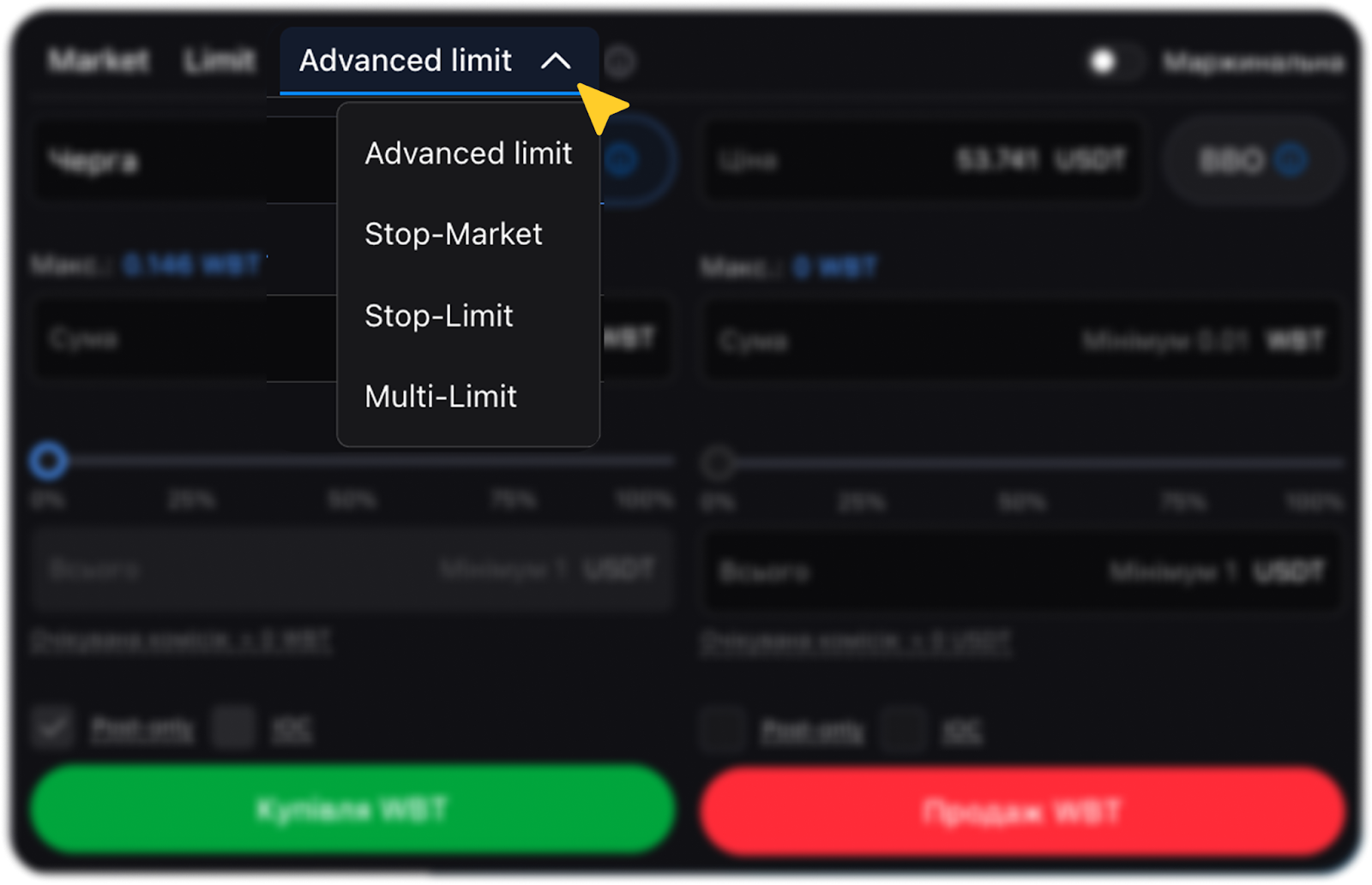 - Розширений Limit (Limit ордер з додатковими умовами виконання: лише розміщення (Post-only), BBO або IOC)