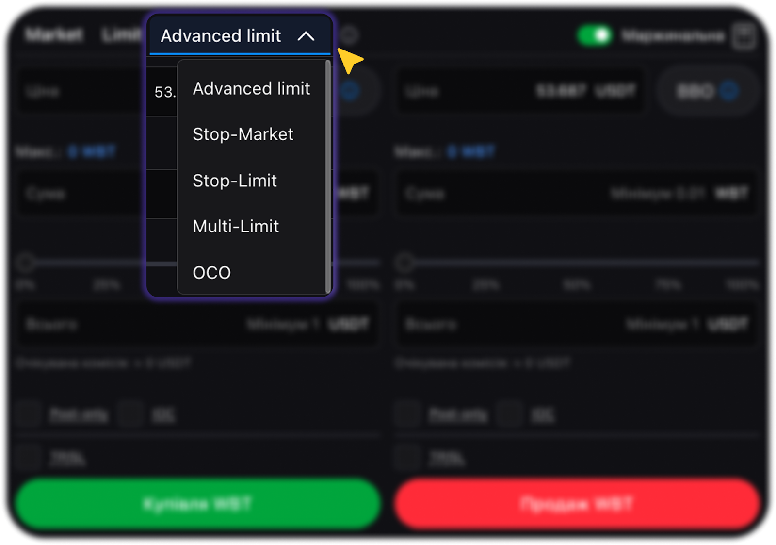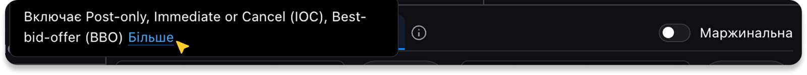 - Іконка інформації (натисніть, щоб побачити коротке пояснення обраного типу ордера) або іконка вибору (натисніть, щоб переглянути список з короткими описами типів ордерів)