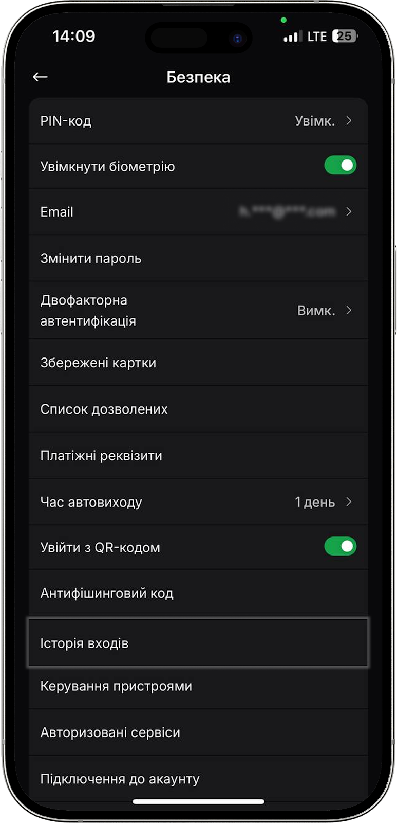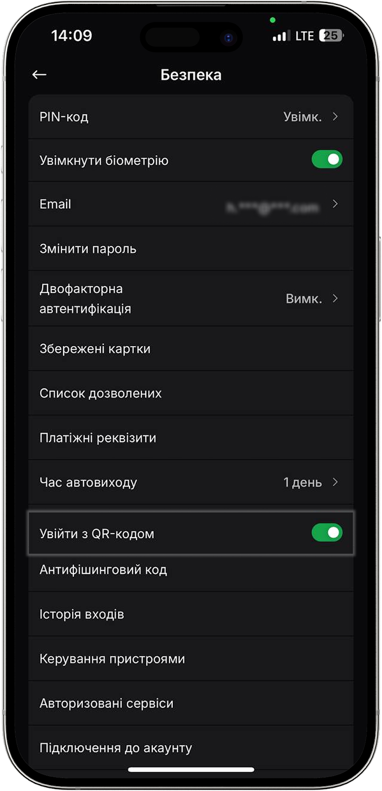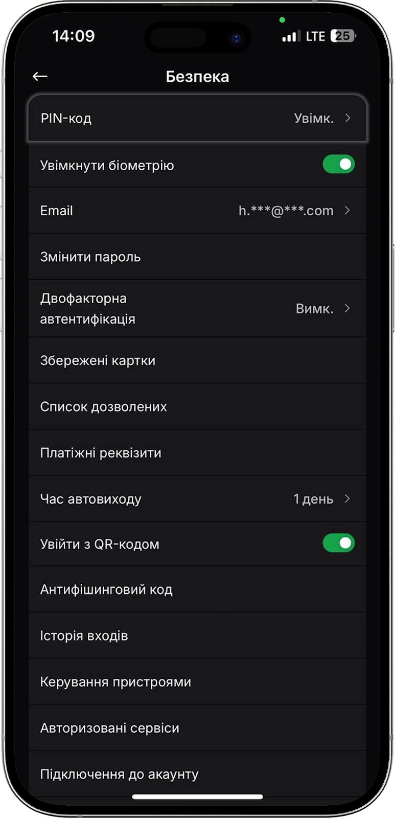 Тут знаходиться перемикач для активації входу в мобільний додаток за Face ID або ж відбитком пальця. Якщо хочете вимкнути цю функцію, просто деактивуйте перемикач.