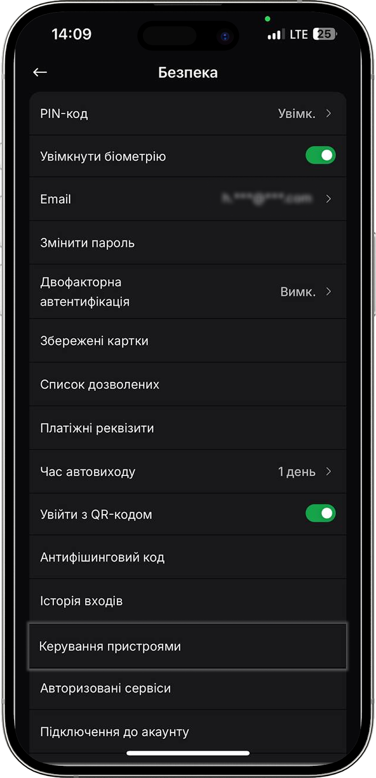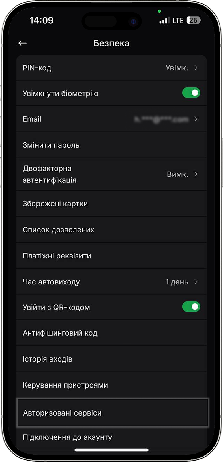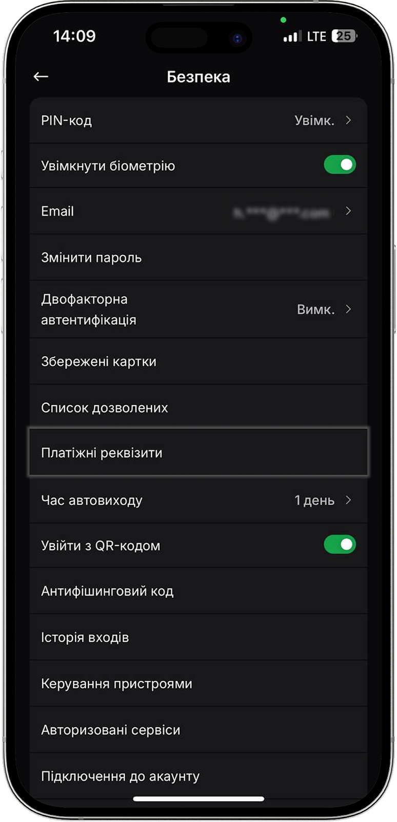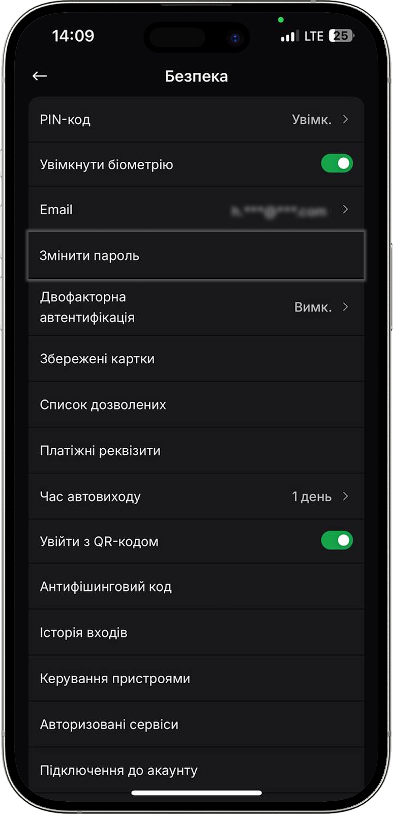 Тут знаходиться перемикач для активації входу в мобільний додаток за Face ID або ж відбитком пальця. Якщо хочете вимкнути цю функцію, просто деактивуйте перемикач.