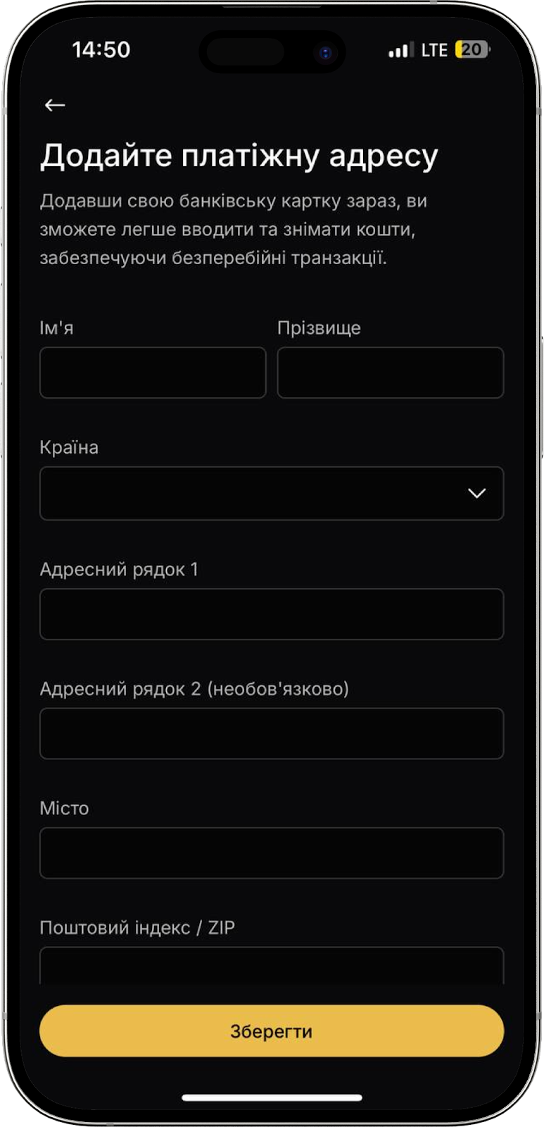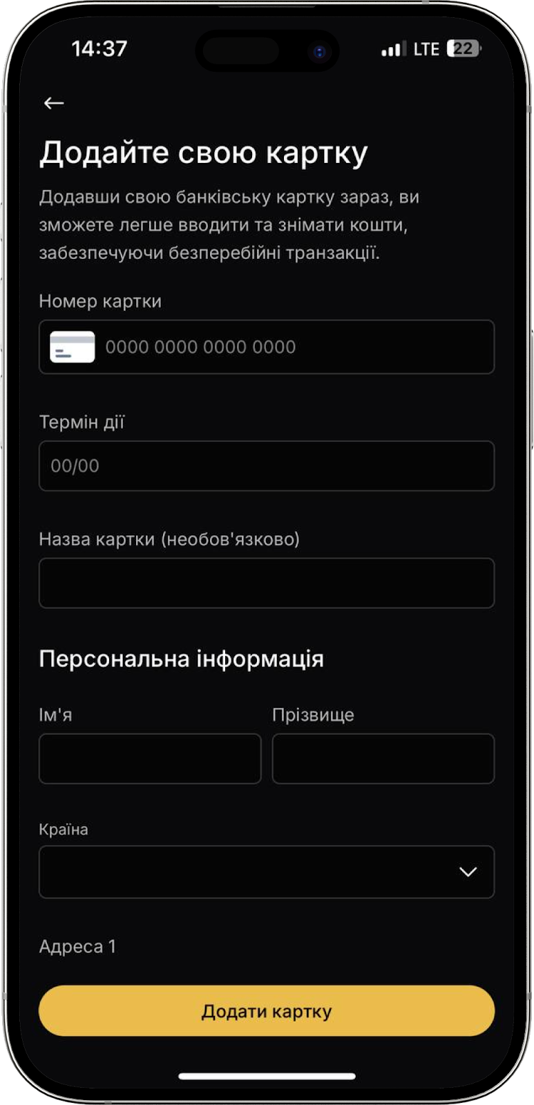 Тут ви можете додати свою банківську картку, щоб швидше та простіше поповнювати свій акаунт. Для того, щоб додати картку потрібно вказати номер картки, термін дії, назву (необов’язково), ваше ім’я та прізвище, країну проживання, адресу, місто та поштовий індекс.