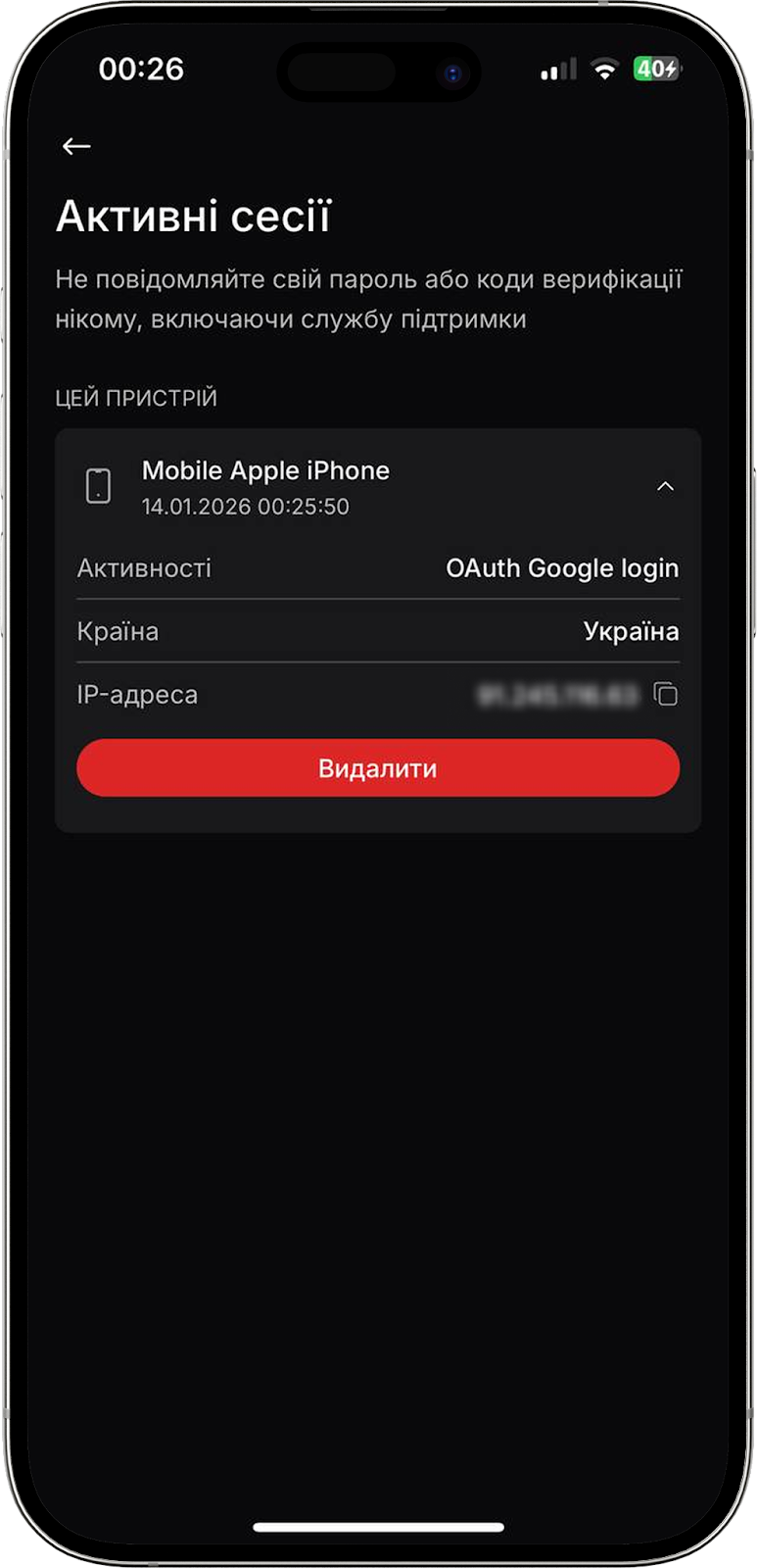 Ви можете заходити в обліковий запис з різних пристроїв, включно з мобільними телефонами, планшетами та іншими комп'ютерами. У розділі “Керування пристроями” ви можете скасувати як одну конкретну сесію, натиснувши “Видалити”, так і всі активні сесії з усіх пристроїв одночасно, натиснувши на символ кошика.