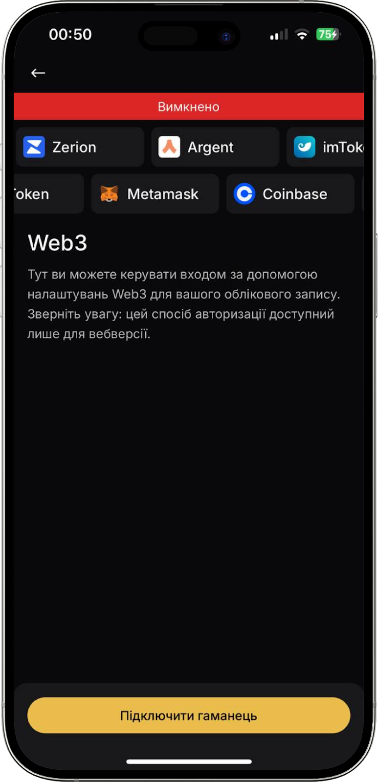 Авторизуватися на WhiteBIT можна ще за допомогою Web3-гаманця. Аби скористатися цією функцією, потрібно встановити розширення для свого гаманця у браузері та увімкнути двофакторну автентифікацію на біржі. У блоці “Web3” знайдіть в переліку необхідний вам гаманець. У випадку, якщо саме вашого гаманця немає у списку, натисніть “Мені пощастить”, що дозволить системі виявити розширення гаманця, що під’єднане до вашого браузера.