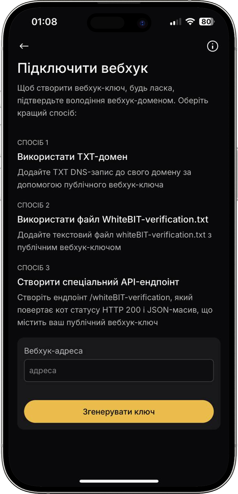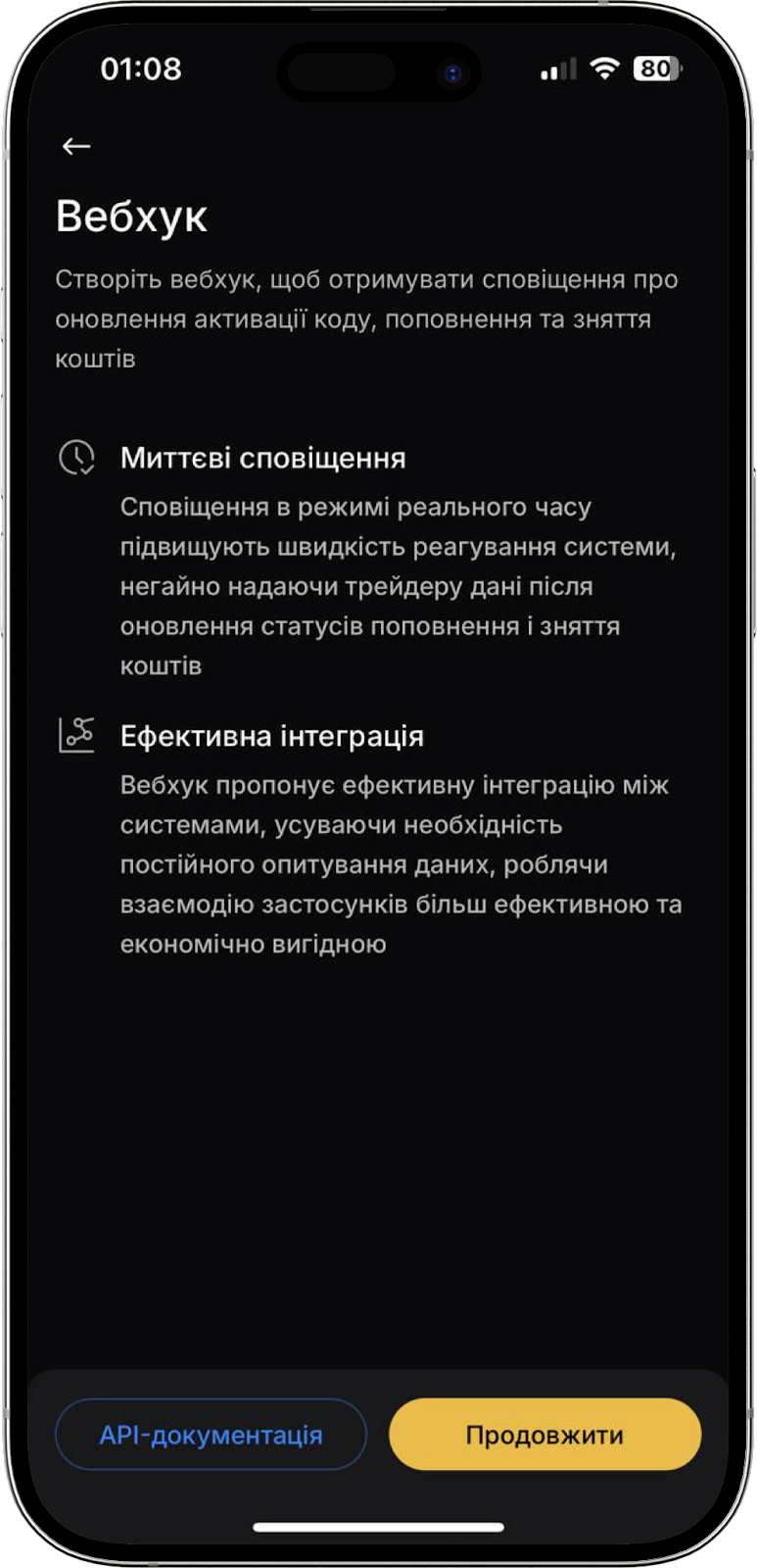 Функція дозволяє отримувати повідомлення про активацію коду або підтвердження поповнення балансу. Натисніть “Продовжити”. У вікні, що відкриється, зазначте адресу вебхуку та натисніть “Згенерувати ключ”. Введіть код 2FA та натисніть “Підтвердити”. Готово!