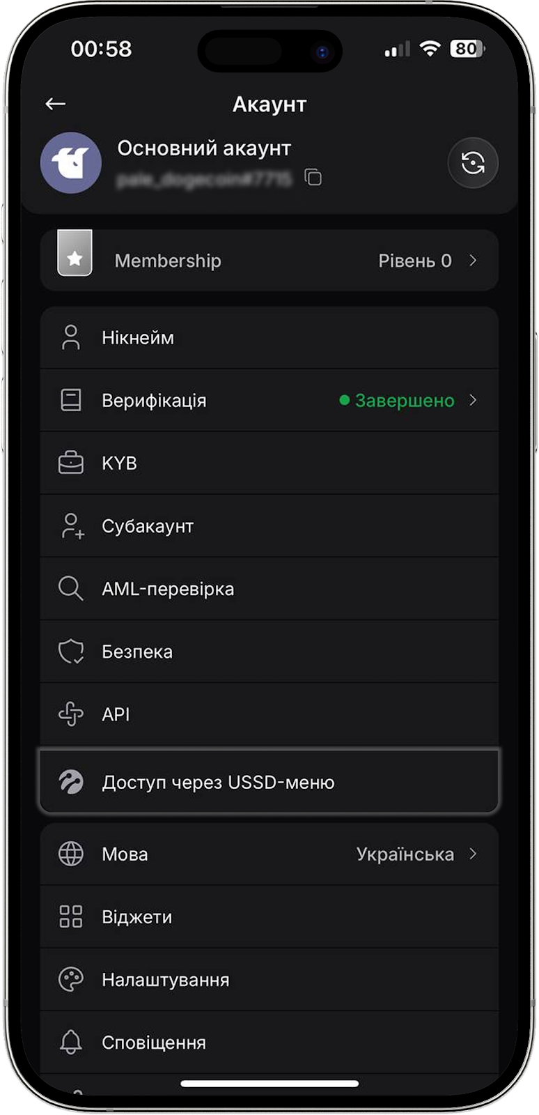 - Нікнейм, Верифікація, KYB, Субакаунт, AML-перевірка, Безпека, API, Доступ через USSD-меню.