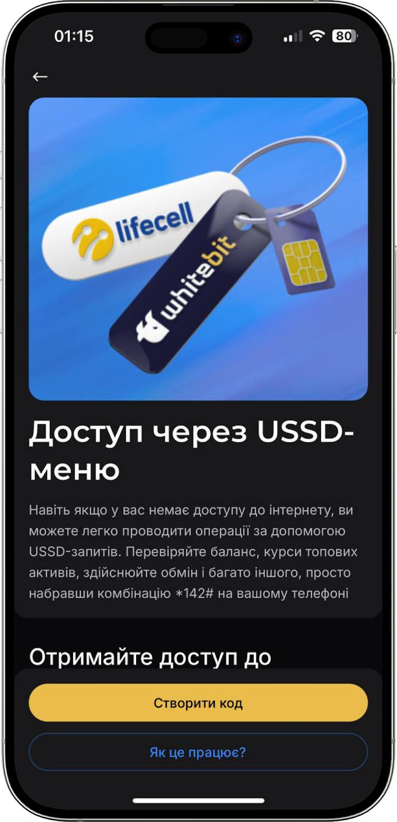 Функція USSD-меню дозволяє отримати доступ до деяких операцій на біржі WhiteBIT без підключення до Інтернету. Користувачі з України, які користуються послугами мобільного оператора lifecell, можуть під'єднати свій обліковий запис на біржі до номера lifecell та мати доступ до перегляду балансу, трансферу та обміну коштів, а також отримання адреси для депозиту. Якщо ця функція у вас не під’єднана, натисніть “Створити код”. Введіть код 2FA та дотримуйтеся інструкції.