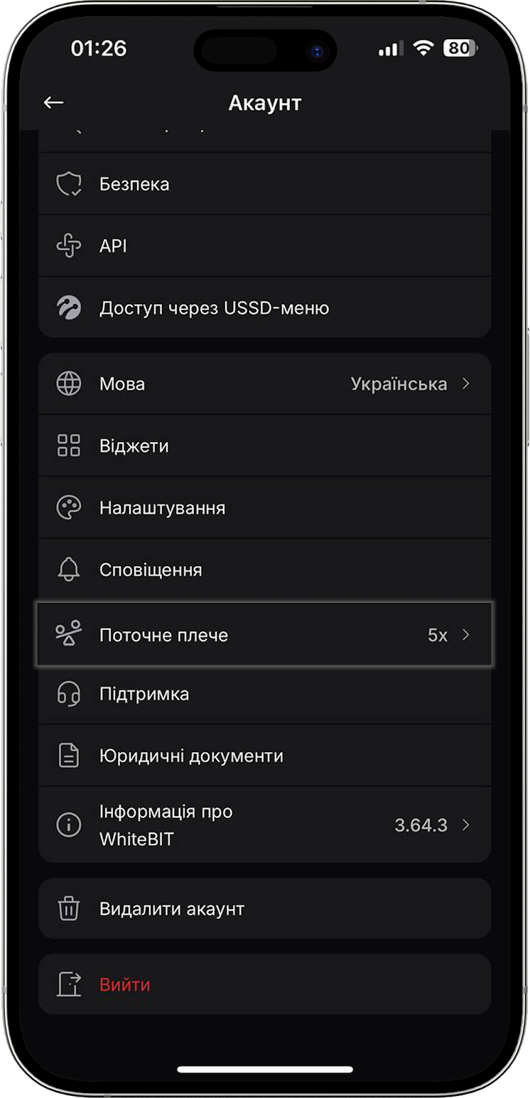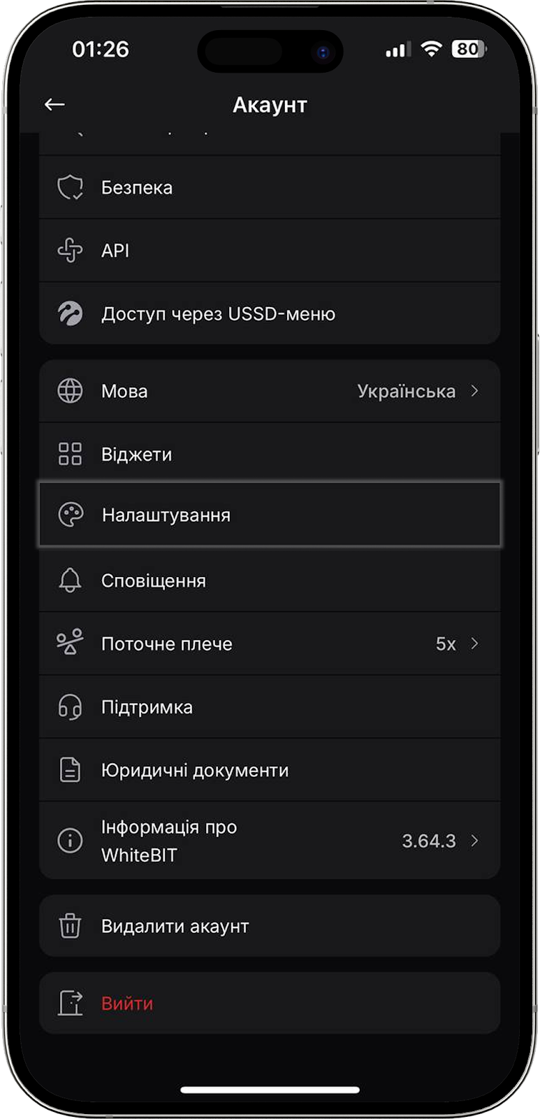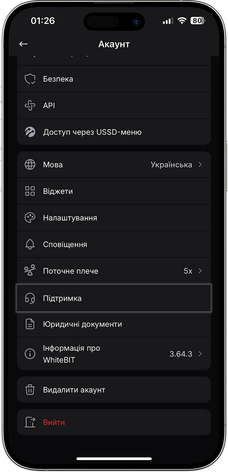 Натиснувши на цю кнопку, ви можете вийти з вашого облікового запису WhiteBIT в мобільному додатку.