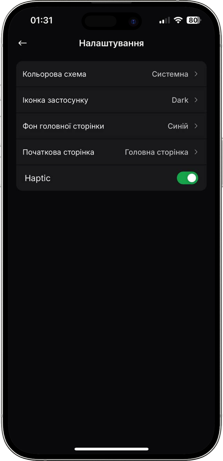 У цьому розділі у вас є можливість налаштувати дизайн мобільного додатка WhiteBIT. Наприклад, можна змінити кольорову схему (темна, світла чи системна) та колір фону головної сторінки, обрати іконку застосунку та сторінку, яка буде відображатися після входу в додаток (Головна, Торгувати чи Гаманець), активувати чи вимкнути опцію Haptic, яка вмикає тактильний зворотний зв’язок (телефон вібрує, коли ви натискаєте кнопки, перемикаєте опції або робите жести (свайп, підтвердження дії, тощо).