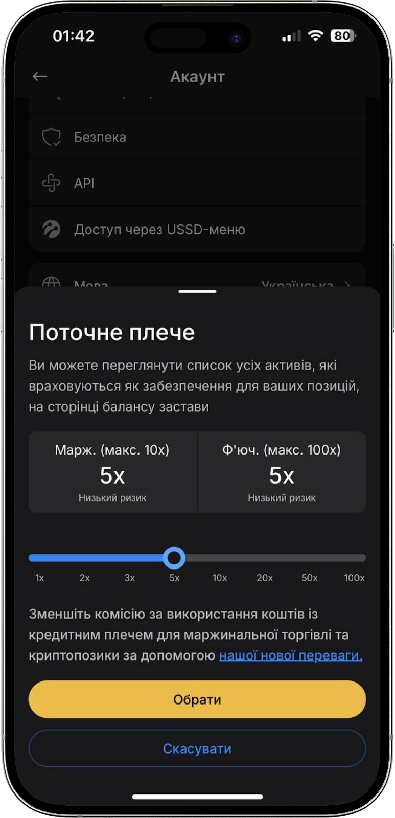 Розмір плеча — це співвідношення позикових коштів до ваших коштів, які ви використовуєте у маржинальній торгівлі. У розділі “Акаунт” ним можна керувати. Натисніть на рядок “Поточне плече”, оберіть розмір, скориставшись повзунком, та натисніть “Обрати”.