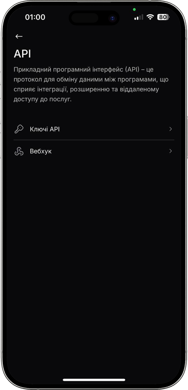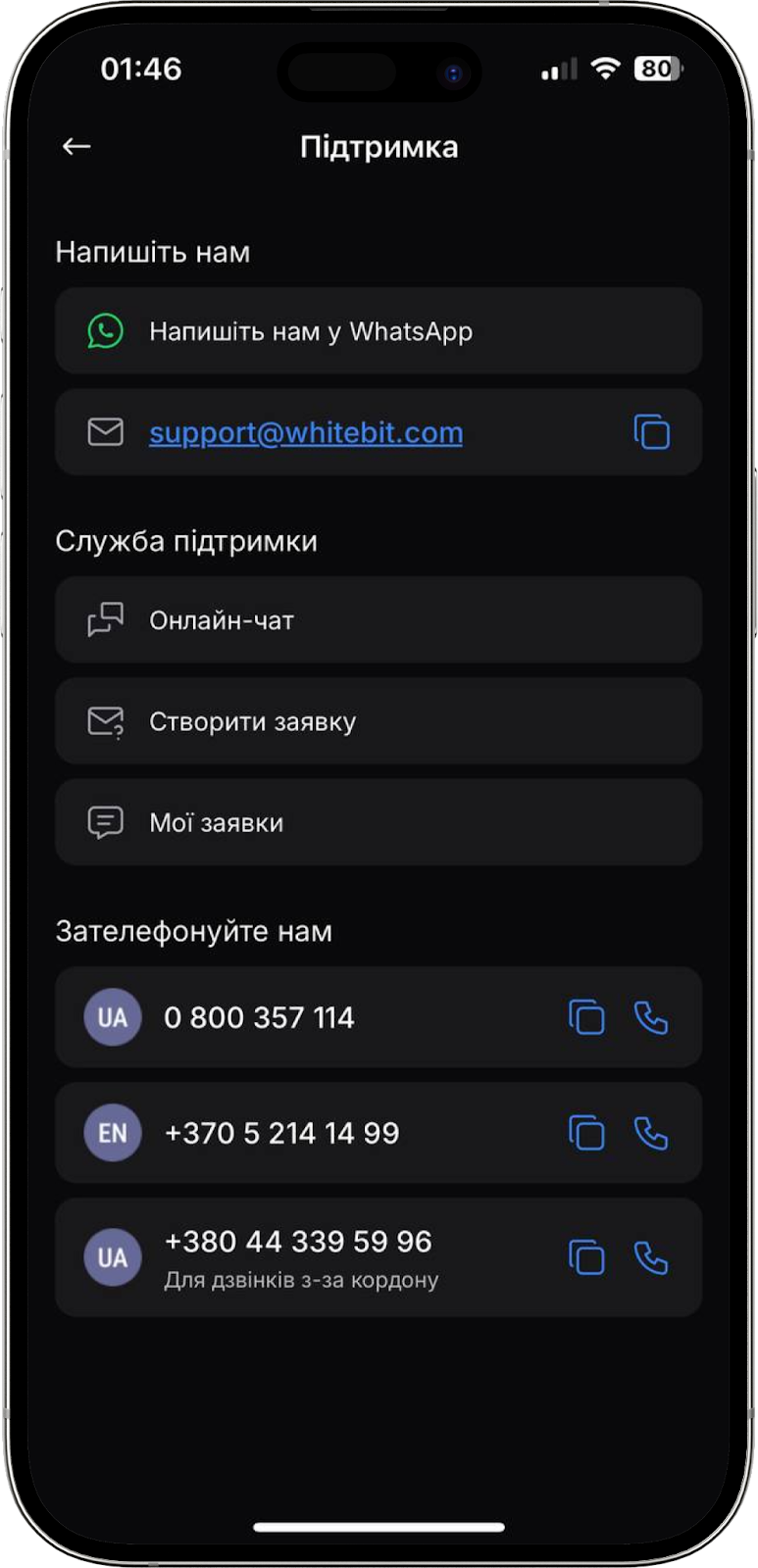 Натиснувши на рядок “Підтримка” у додатку відкриється сторінка з усіма можливими варіантами звернення в нашу службу підтримки: онлайн-чат, створення тікета, звернення на пошту, телефонний дзвінок, WhatsApp.