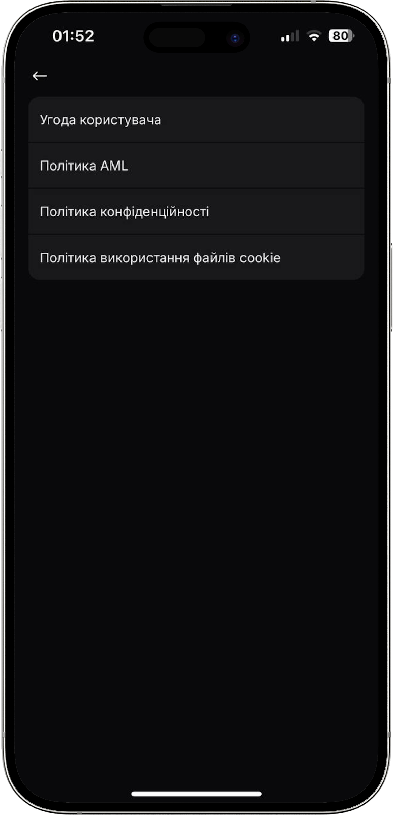 У цьому розділі можна ознайомитися з нашою Угодою Користувача, Політикою AML, Політикою конфіденційності та Політикою використання файлів cookie.