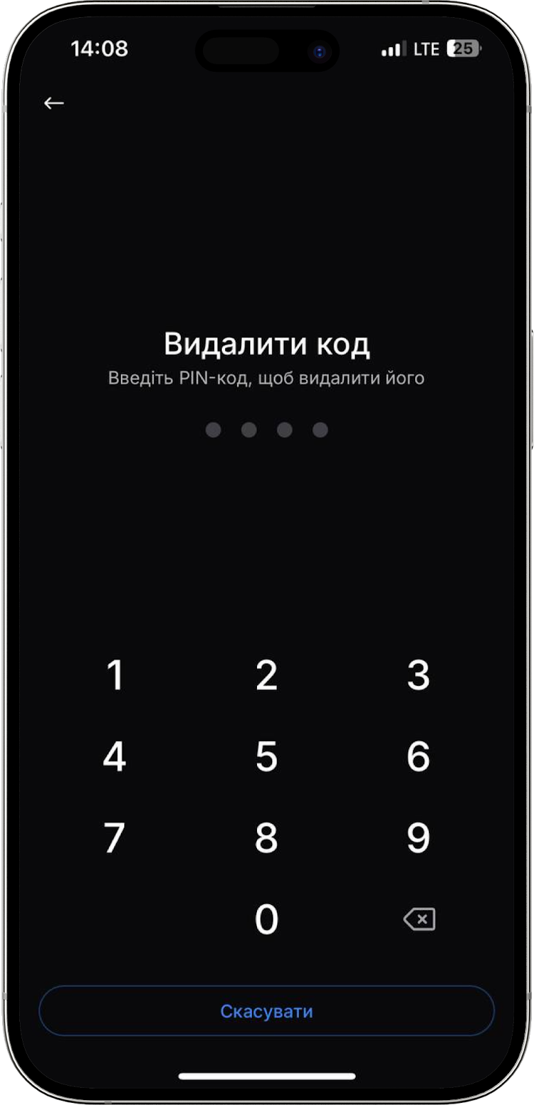 Ми можете встановити або ж видалити PIN-код, який потрібен для входу в мобільний застосунок біржі. Щоб створити PIN-код, просто придумайте та введіть 4-х значне число, а потім підтвердіть код, ввівши його повторно. Для видалення PIN-коду введіть придуманий вами раніше код.
