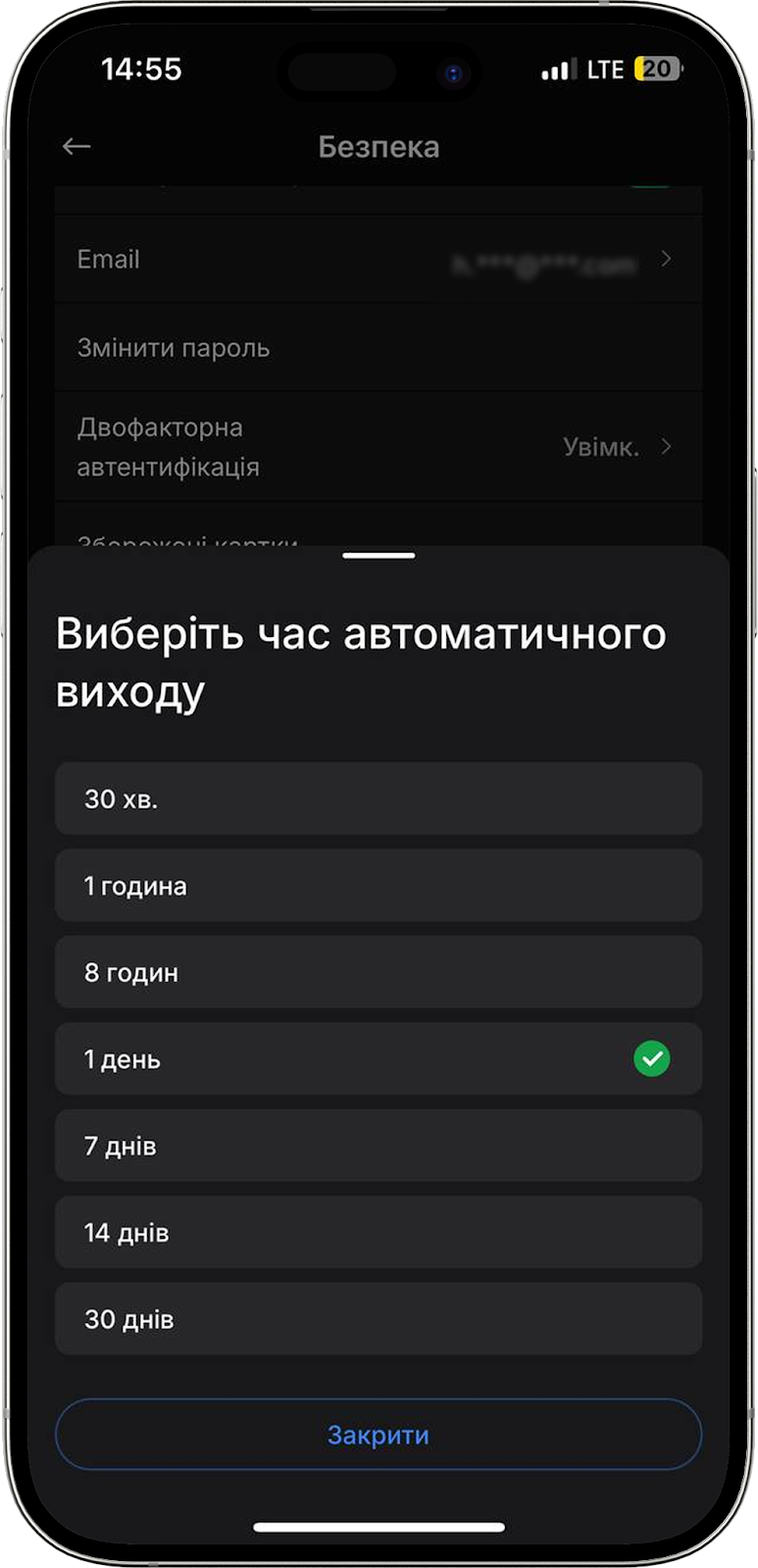 У цьому блоці можна встановити час автоматичного виходу з облікового запису в умовах відсутності активності. Якщо ви зайшли в обліковий запис та забули вийти, функція закриє доступ до облікового запису для пристрою, з якого ви виконали вхід. Доступні часові проміжки — 30 хвилин, 1 година, 8 годин, 1 день, 7 днів, 14 днів, 30 днів.