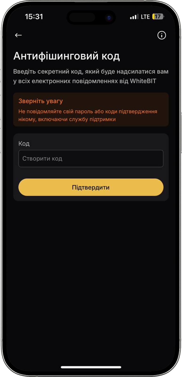 Підтвердивши свій антифішинговий код, ви зможете запобігти спробам фішингу з підроблених веб-сайтів WhiteBIT або e-mail. Щоб перейти до налаштувань, натисніть “Продовжити”, зазначте код та натисніть “Зберегти”. Щоб підтвердити операцію, введіть код 2FA.