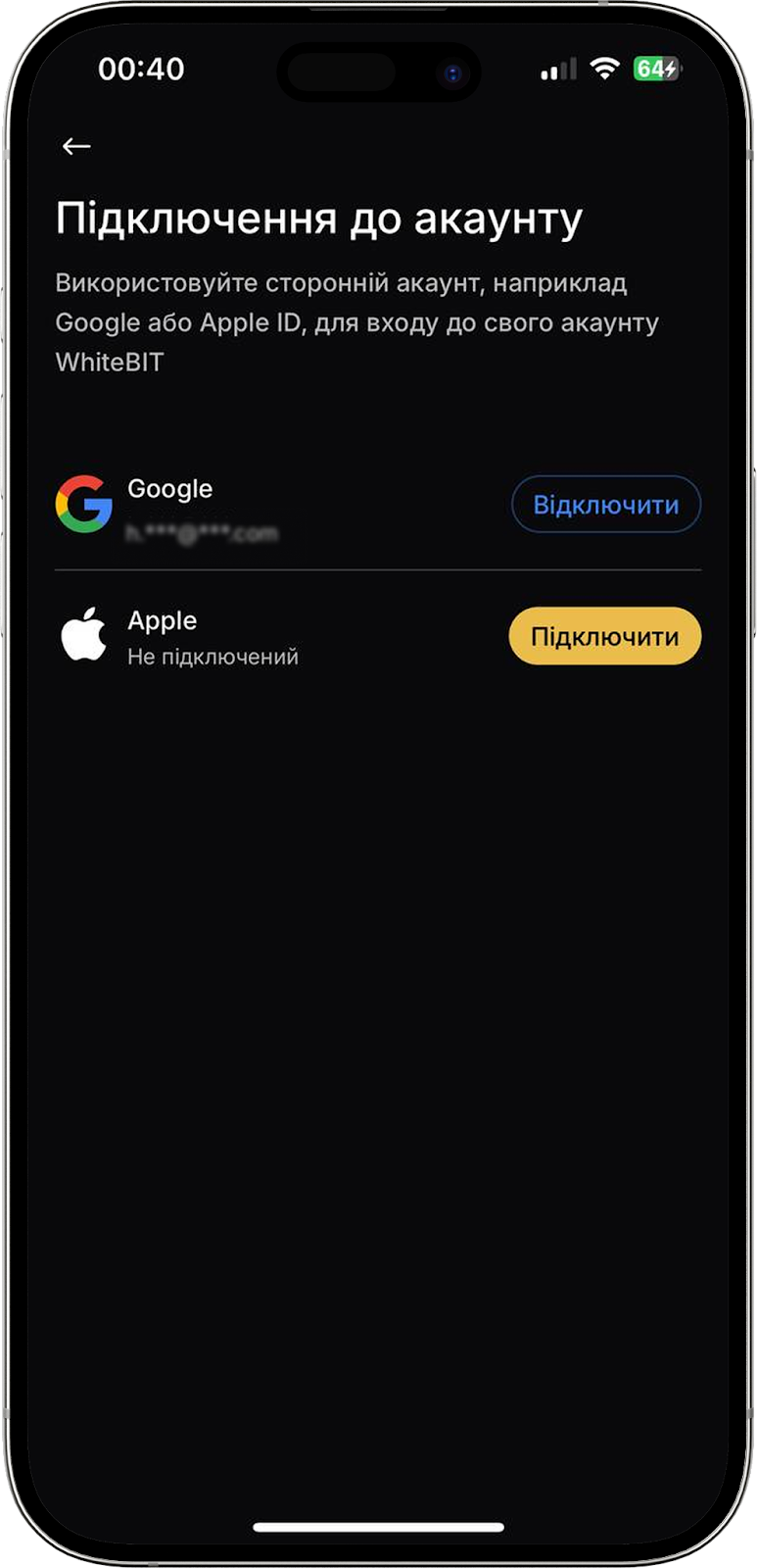 Тут ви можете додати або відключити сторонній акаунт, наприклад Google або Apple ID, для входу до свого акаунту WhiteBIT.