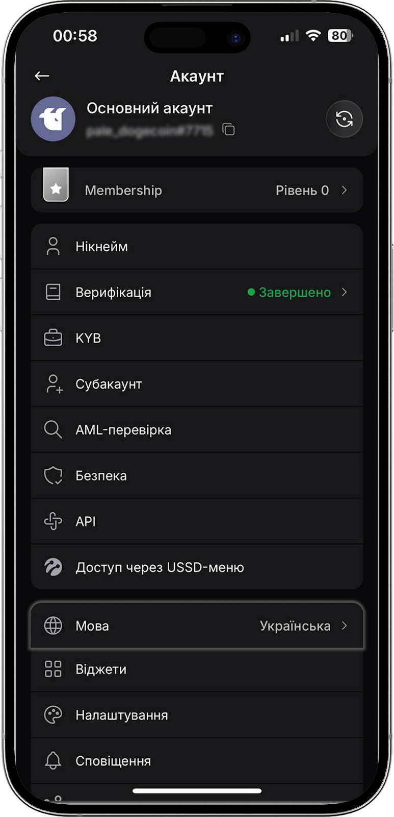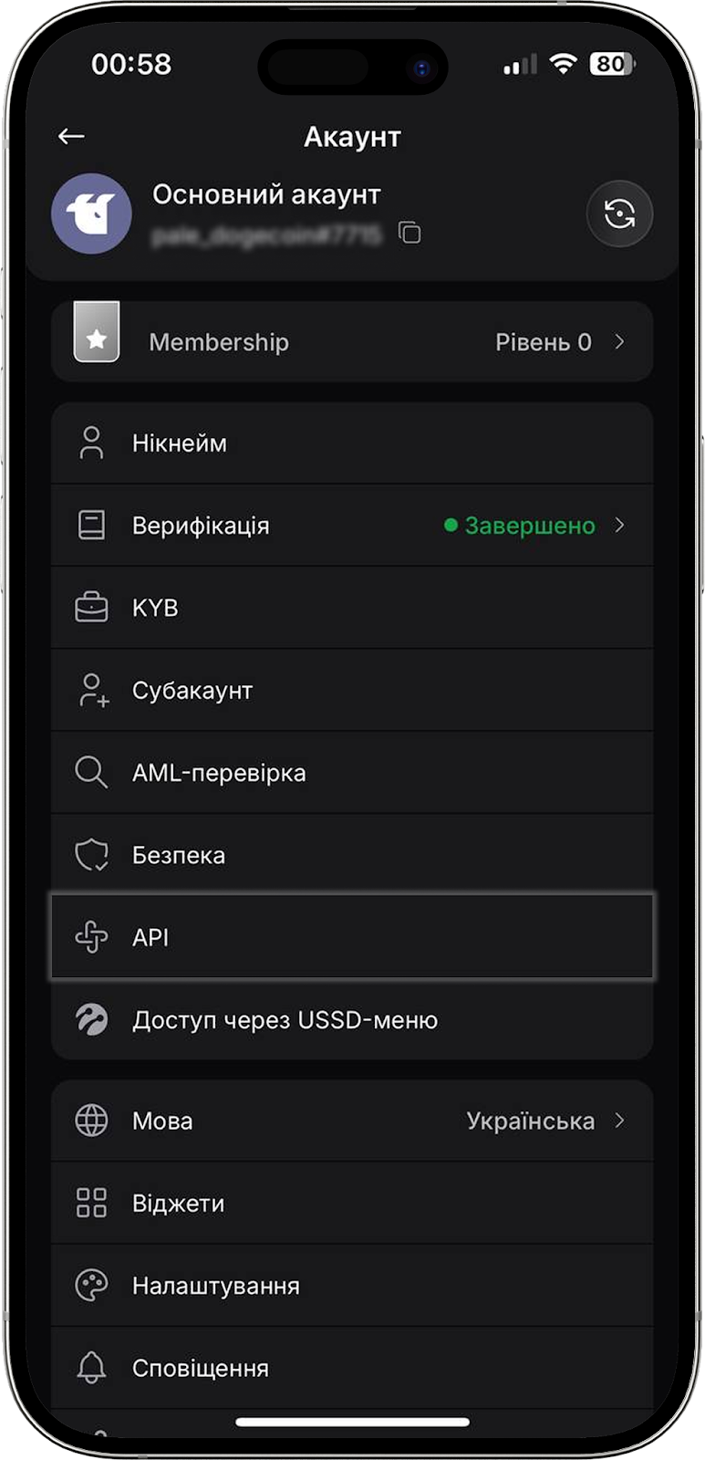 Натиснувши на розділ “Верифікація”, ви можете переглянути ваш поточний статус проходження KYC-верифікації, доступні рівні та їх короткий опис. В цьому ж розділі можна ініціювати проходження верифікації для певного рівня. Детальніше про KYC-верифікації читайте в Центрі Допомоги.