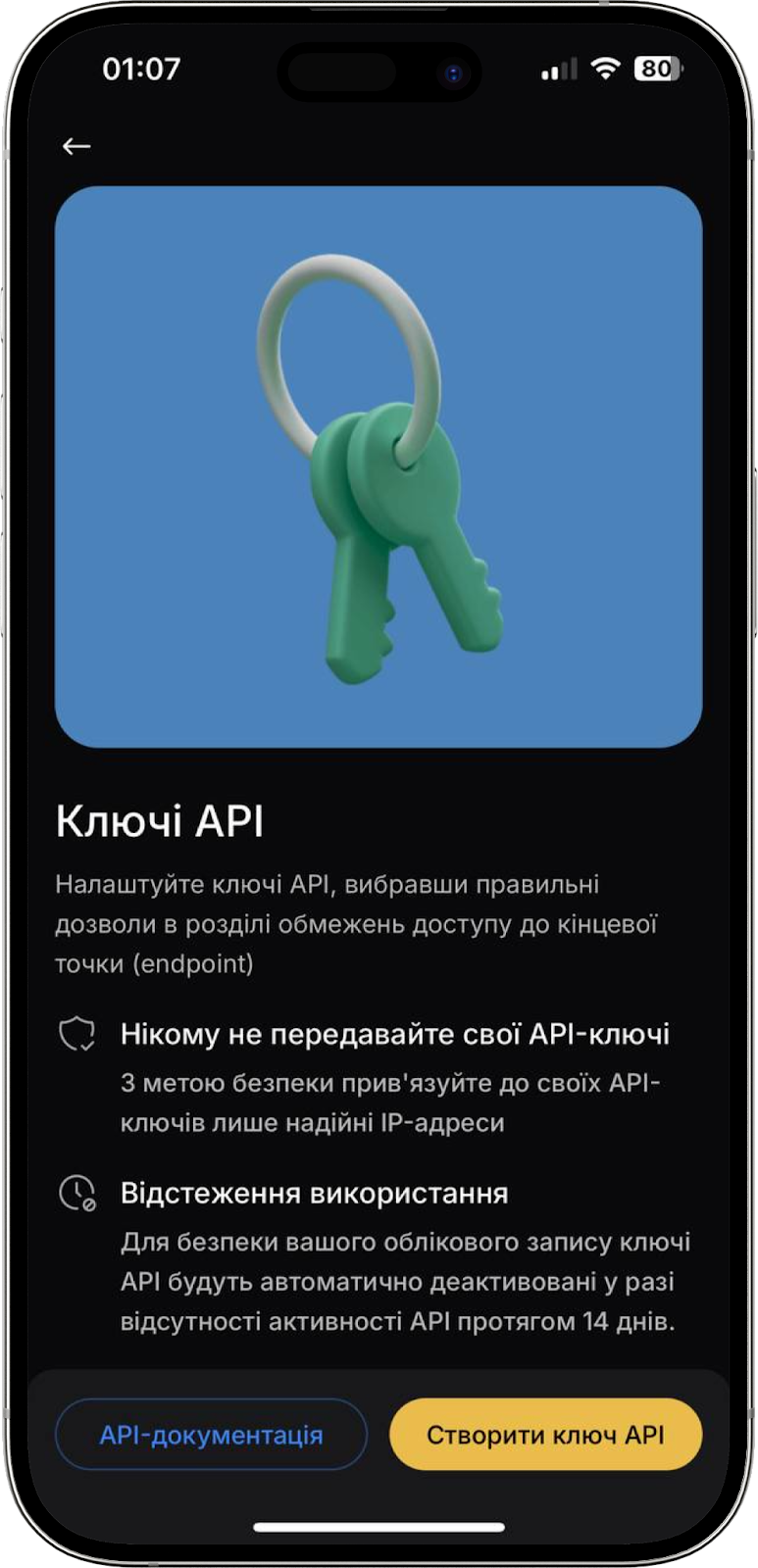 Зверніть увагу: завдяки функції автоматичної деактивації, API-ключ буде автоматично вимкнено у разі відсутності активності протягом 14 днів. Термін дії ключів можна переглянути, натиснувши на “Ключі АРІ”.