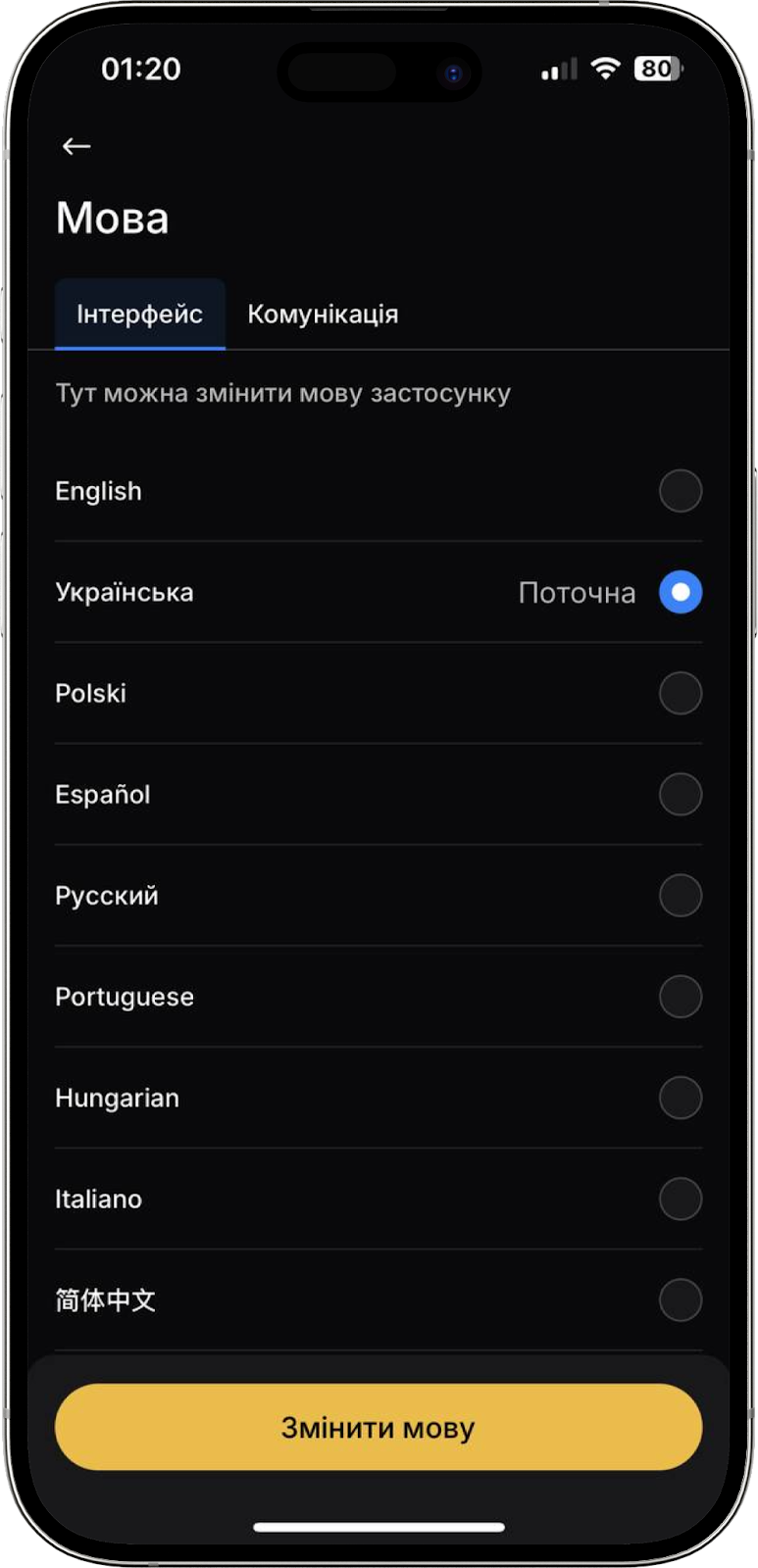 Перейшовши до вкладки “Мова” у вас буде можливість змінити мову застосунку або комунікації (мову системних/маркетингових електронних листів та push-повідомлень). Для цього оберіть “Інтерфейс” або “Комунікація”, виберіть одну з доступних мов зі списку та натисніть “Змінити мову”.