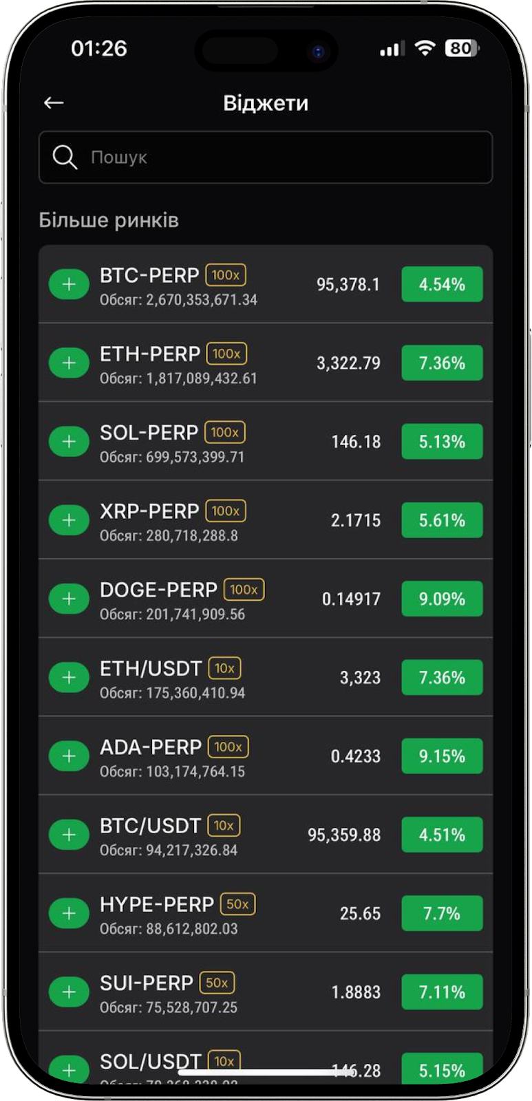 Тут ви можете додати віджет на головний екран вашого мобільного пристрою. Використовуючи даний функціонал, можна переглядати актуальний курс криптовалют не авторизуючись на біржі. Оберіть пари, за ціною яких ви бажаєте стежити, серед списку маркетів, натиснувши на “+”, що знаходиться зліва у рядку кожної з торгових пар.