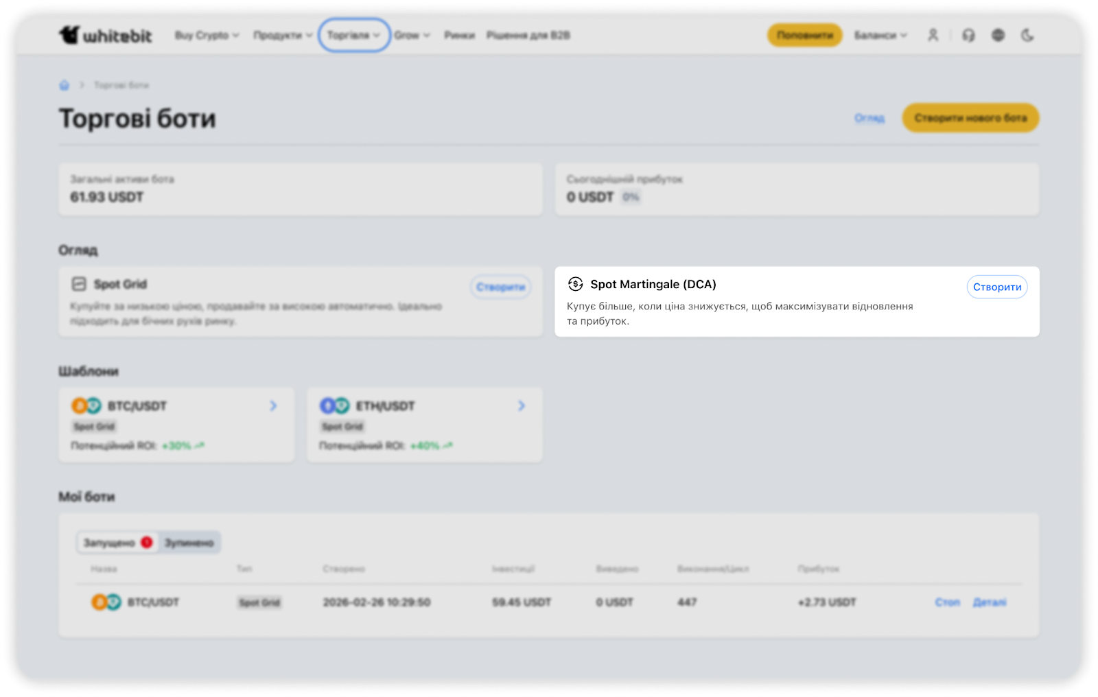 Інтерфейс Спот DCA Бота надає огляд стратегії та шаблони швидкого запуску для популярних торгових пар. Ви можете створити новий бот або скористатися пресетами, згенерованими ШІ, з орієнтовними даними про ефективність для пар BTC/USDT та ETH/USDT. У розділі «Мої боти» відображатимуться ваші активні боти після їх створення.