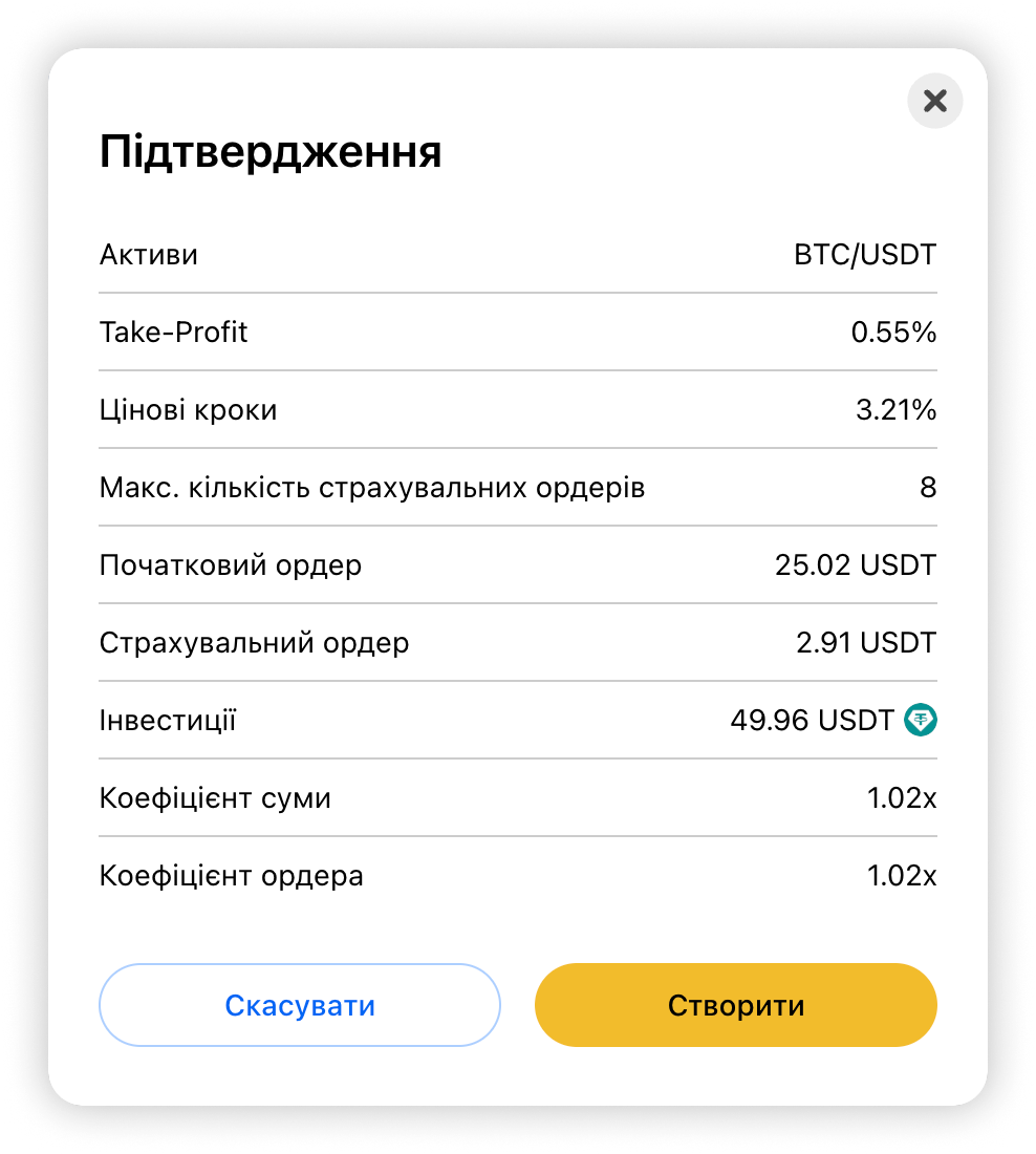 Перед запуском бота ви побачите чіткий попередній перегляд усіх параметрів — включно з орієнтовним максимальним необхідним капіталом по всіх страхувальних ордерах — щоб заздалегідь оцінити свої ризики. Якщо балансу недостатньо, надається зручне посилання на поповнення, щоб ви могли поповнити кошти без виходу зі сторінки налаштування.