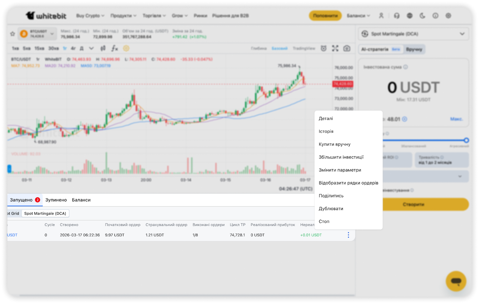 Спот DCA (Мартингейл) Бот на WhiteBIT — це автоматизований торговий інструмент, розроблений для накопичення позиції під час ринкових просідань із виходом за заданим цільовим прибутком. На відміну від грід-стратегій, які безперервно виставляють ордери на купівлю та продаж у межах діапазону, DCA Бот орієнтований на один цикл: відкриває початкову позицію, додає більші ордери на купівлю в міру зниження ціни для зменшення середньої ціни входу, а потім продає всю позицію після досягнення цільового прибутку.