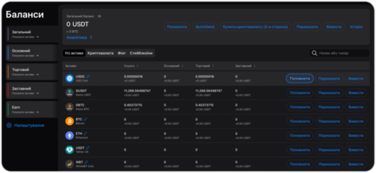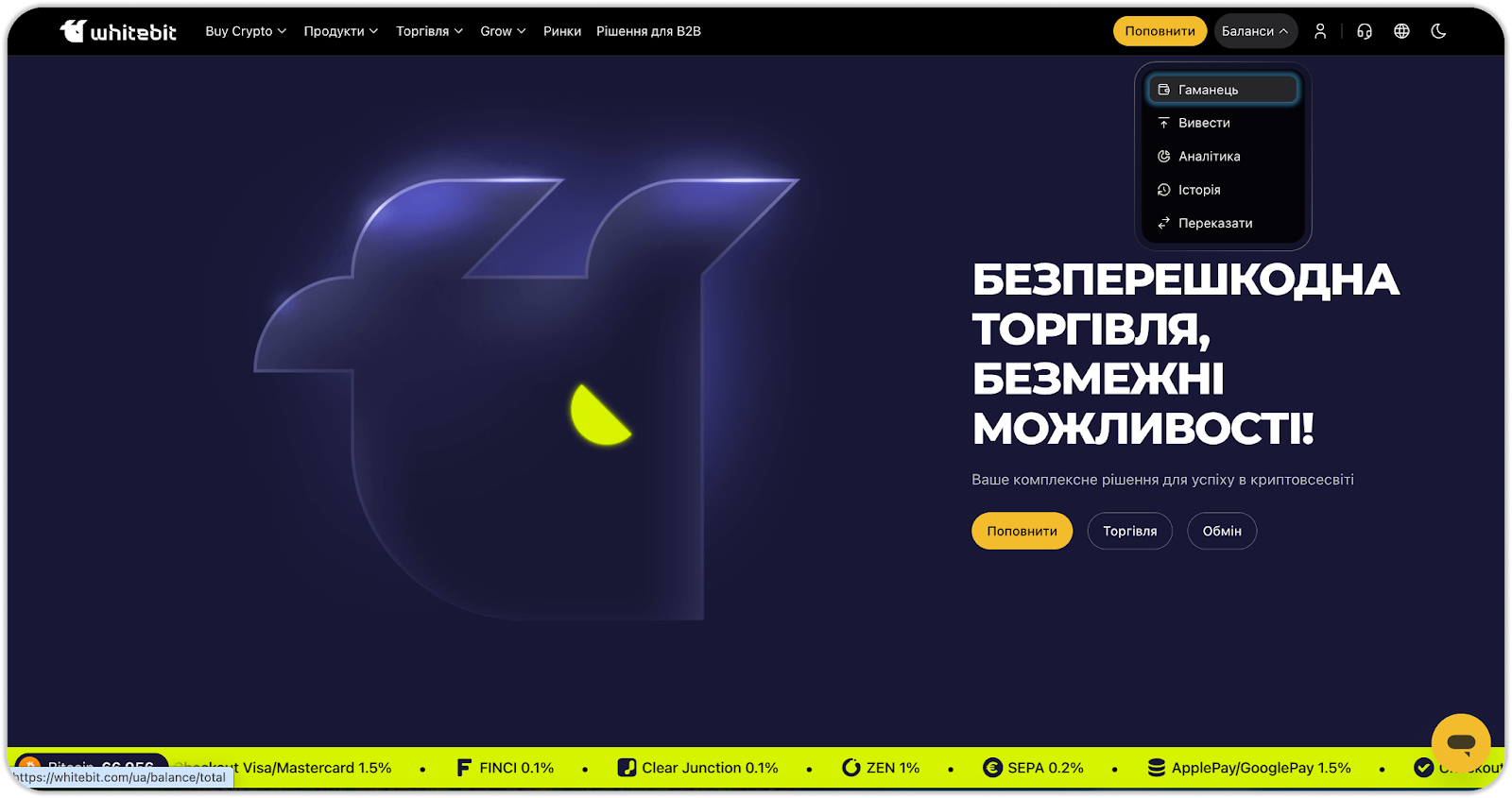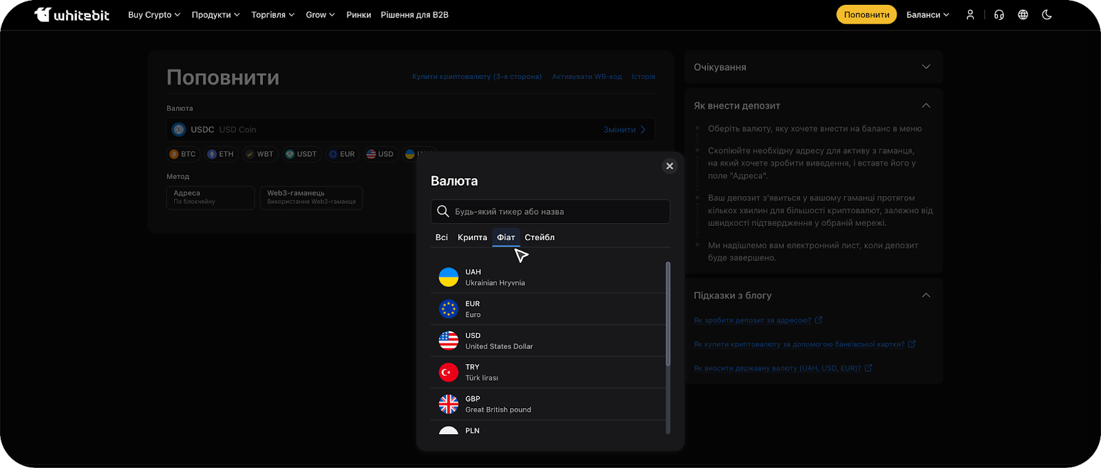Поповнення балансу — це перший крок для початку роботи з повним функціоналом WhiteBIT. Ми пропонуємо кілька способів внесення коштів — від класичних депозитів до внутрішніх інструментів для швидких переказів. У цій статті зібрано всі доступні методи поповнення, щоб ви могли обрати найбільш зручний.