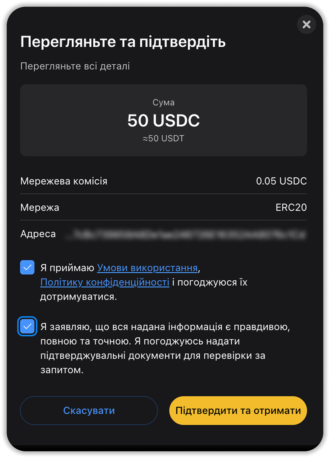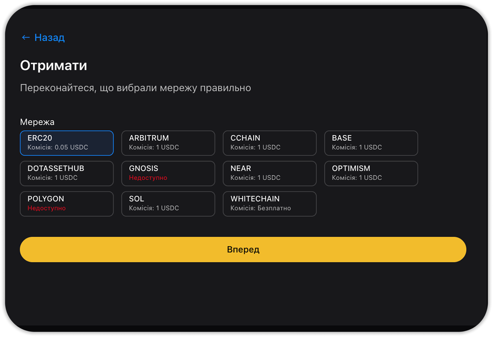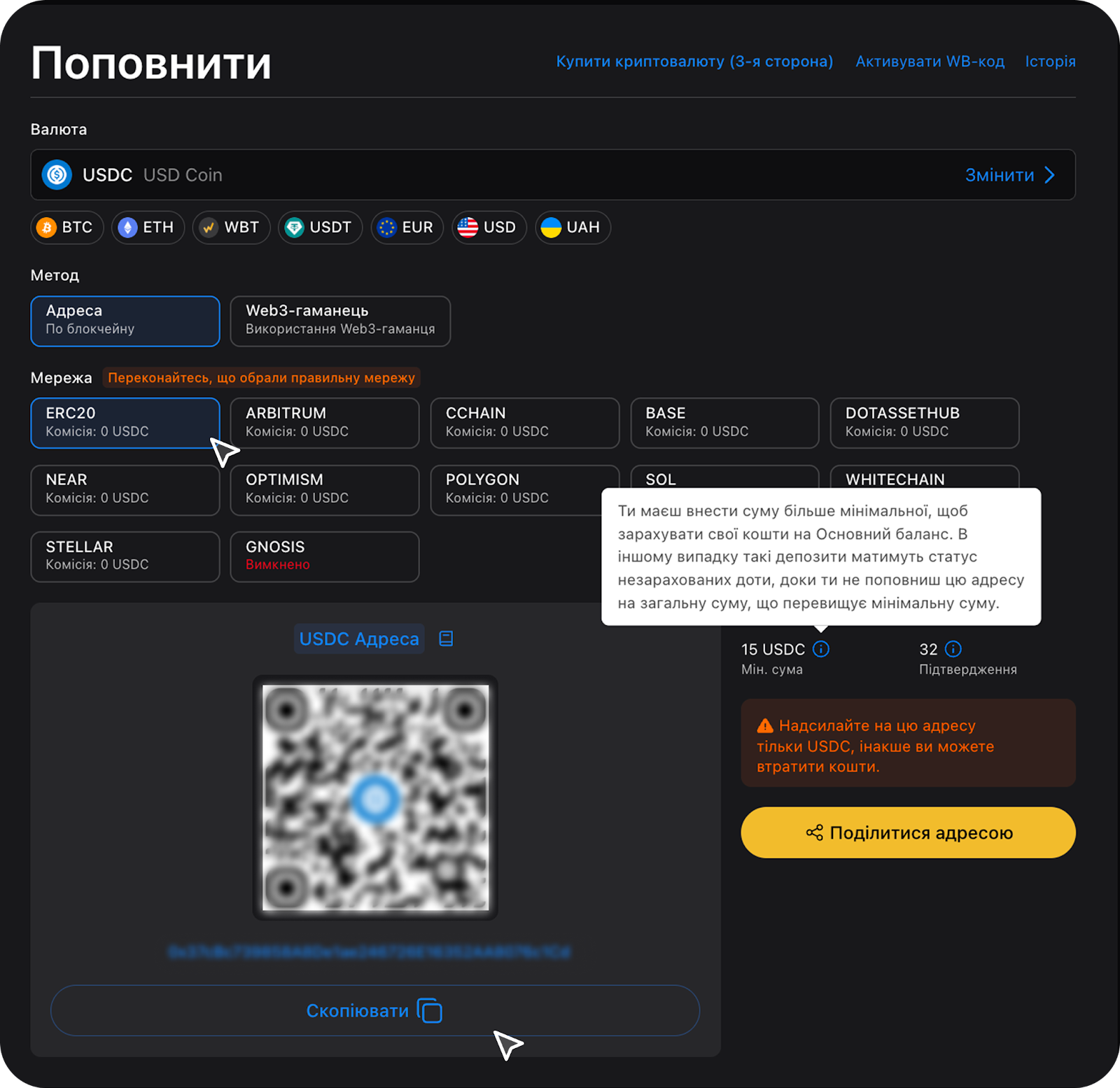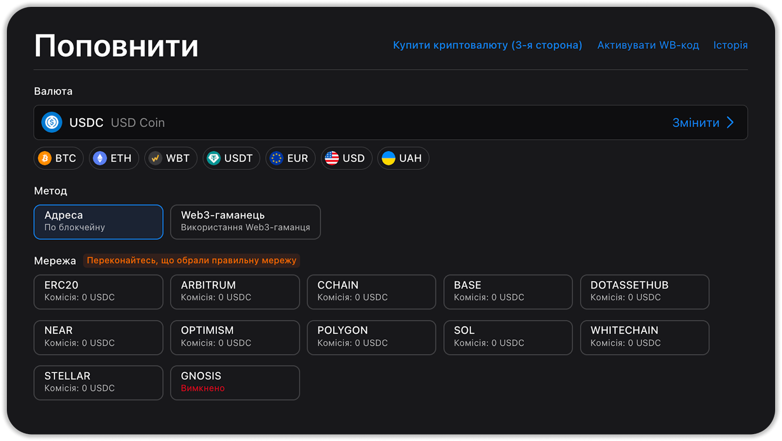 Зверніть увагу: завжди обирайте правильну мережу та перевіряйте адресу перед відправкою коштів. Усі комісії та ліміти при поповненні криптовалюти відображені на сторінці Комісій.