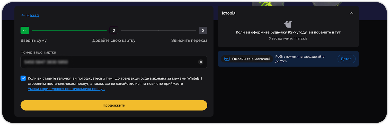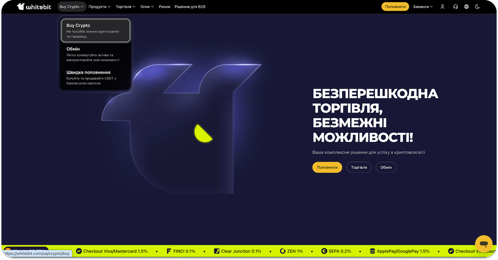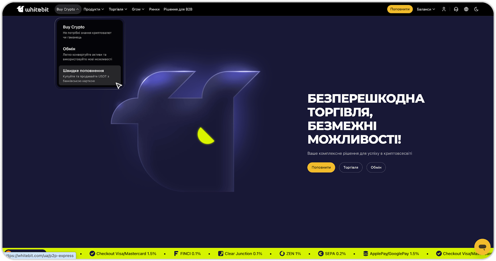 - Поповнення через Checkout Visa/Mastercard на сайті WhiteBIT