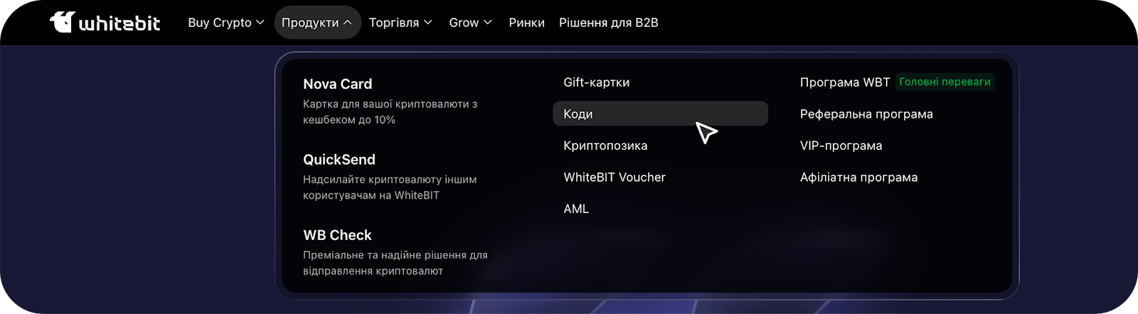 - Перейдіть у розділ “Продукти” — “Коди” у вебверсії або “Продукти WhiteBIT” — “Фінанси” та натисніть “Коди” у мобільному застосунку.