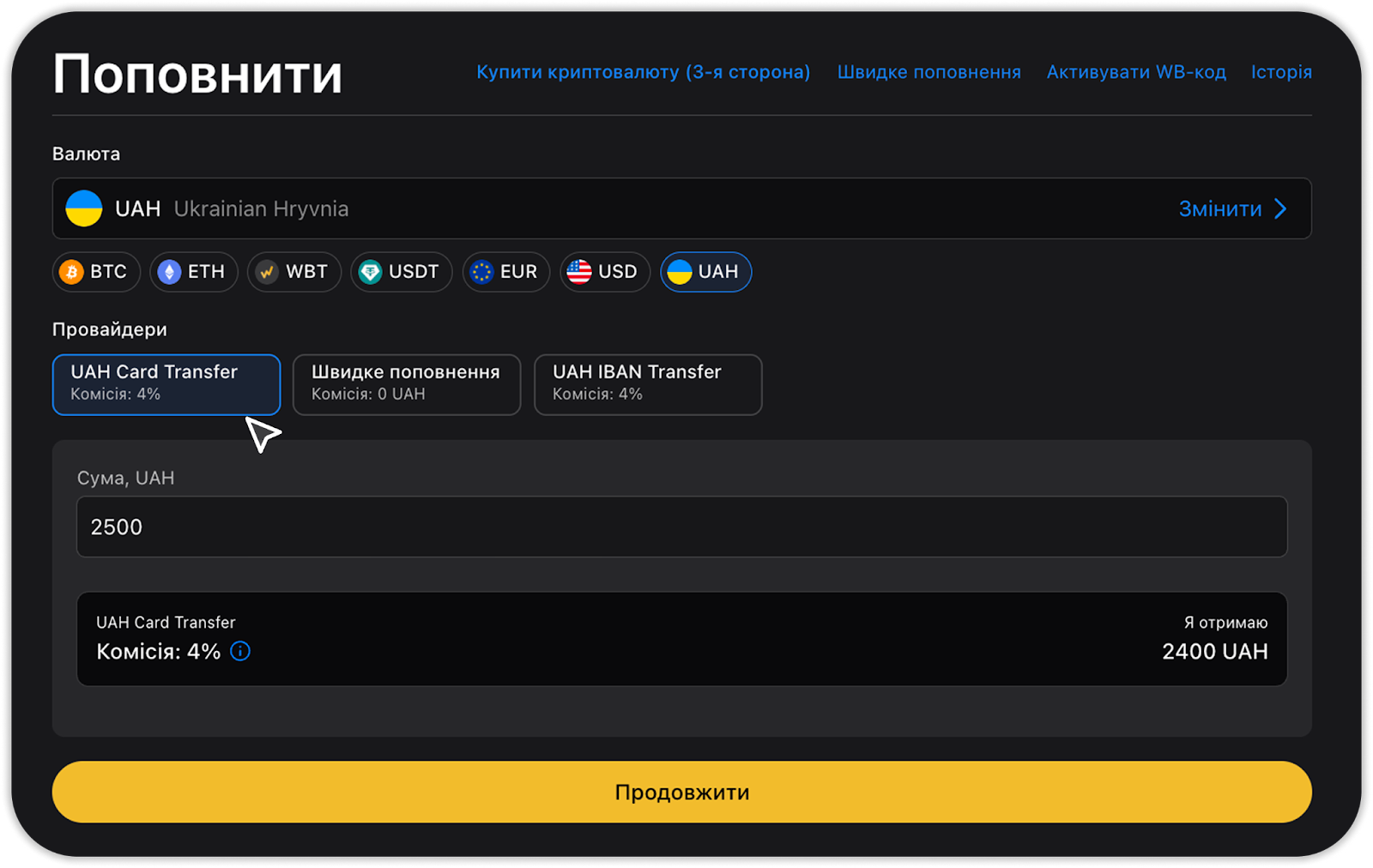 Зверніть увагу: ознайомтеся з добовим лімітом поповнення та сумою поповнення, яку ви отримаєте з урахуванням комісії. Комісія залежить від вибраного провайдера. Усі комісії та ліміти при поповненні державної валюти та доступні провайдери відображені на сторінці Комісій.