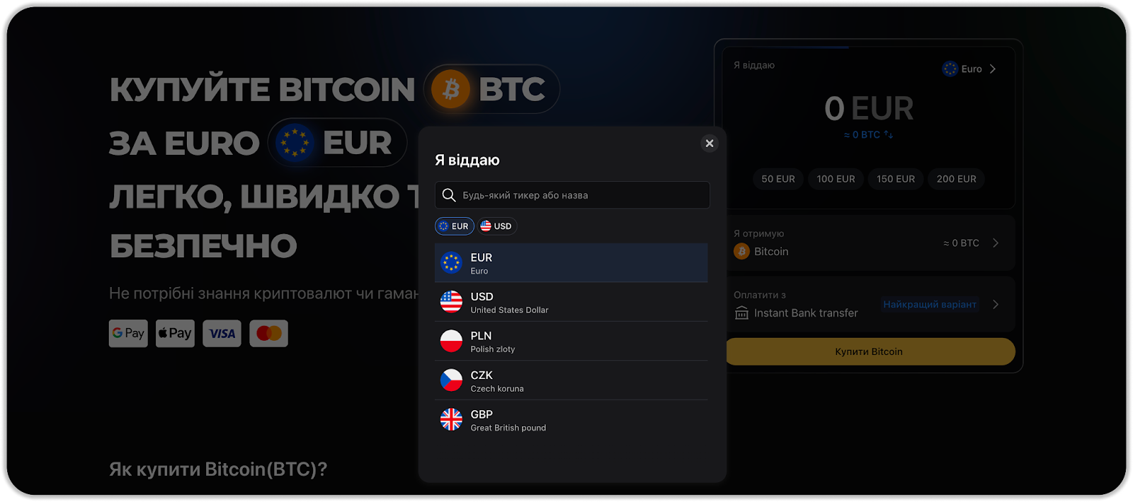 - Оберіть державну валюту (EUR, USD, PLN, CZK, GBP), якою ви бажаєте здійснити оплату, та криптовалюту, яку хочете отримати на гаманець.