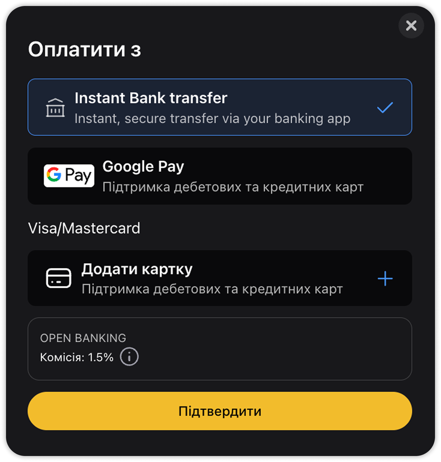 Зверніть увагу: комісія при оплаті методом Apple Pay/Google Pay та Visa/Mastercard становить 1,5% для банків ЄС або 3,5% для банків країн, що не входять до ЄС, а також для комерційних карток.