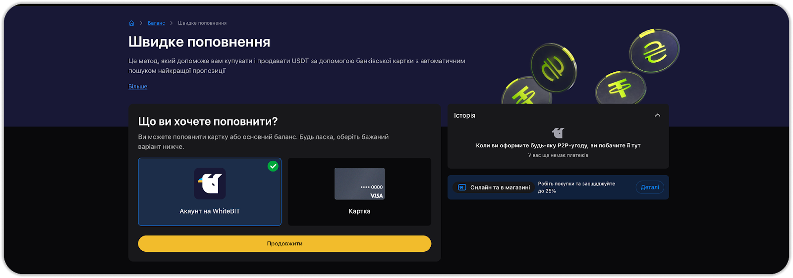 - Оберіть потрібну вам опцію: отримання UAH на картку або USDT на баланс біржі.
